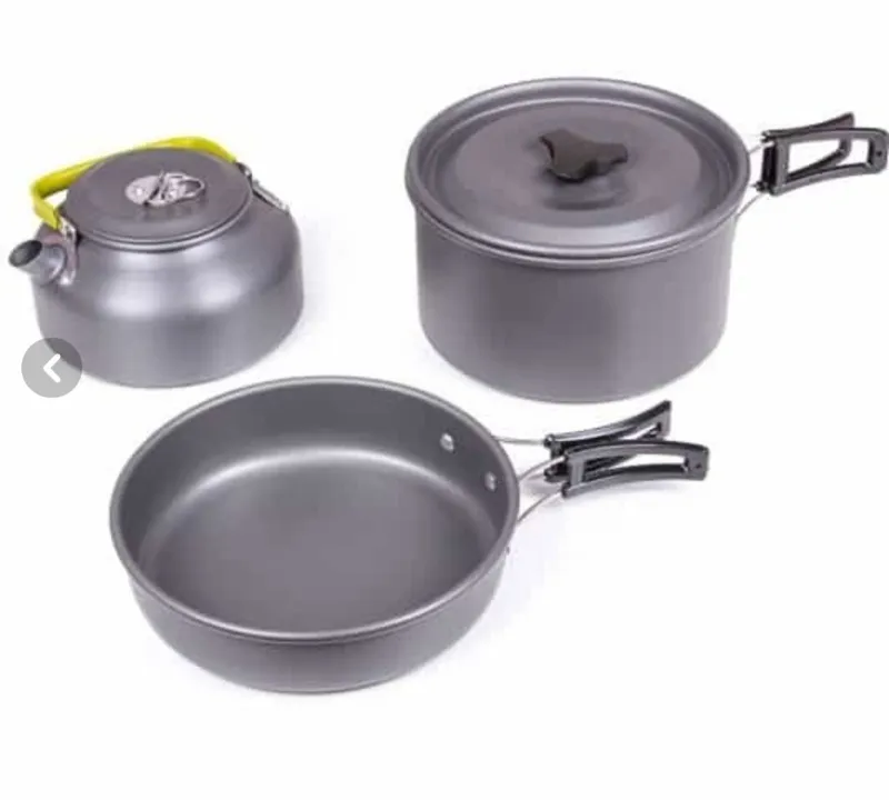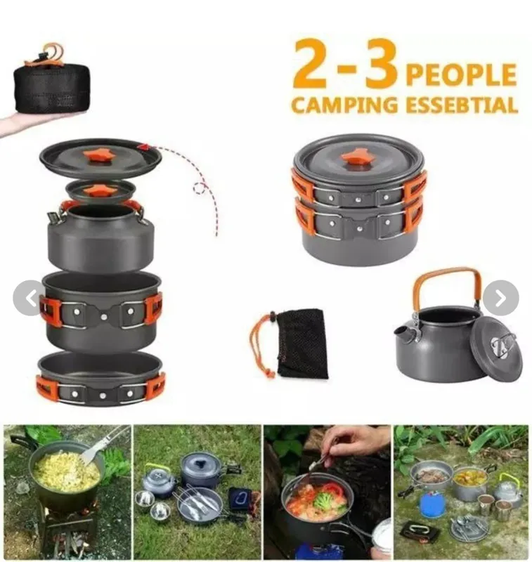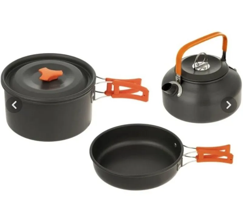 ست ظروف کمپسار بسیار یبک و کهربردی مناسب کمپینگ و کوهنوردی و تفریح شامل تابه ،قابلمه ،و قوری و تور نگهدارنده توجه کنید قاشق چنگال ندارند
