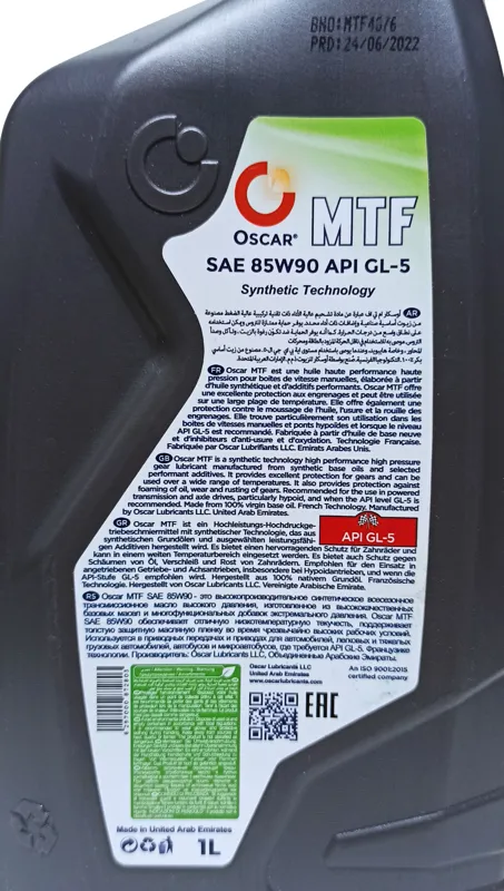 روغن گیربکس دستی اسکار ساخت امارات با تکنولوژی فرانسه دارای گرانروی 85W90ومشخصات GL-5 بر پایه روغن های سینتتیک وافرودنی های لازم برای پایداری در حرارت بالا و محافظت گیربکس طراحی شده است این روغن دارای تاییدیه های معتبر بینالمللی از شرکت های خودروسازی اروپایی می باشد این روغن مناسب کلیه خودروهای خارجی و داخلی است و در گالن های 1 لیتری عرضه میگردد