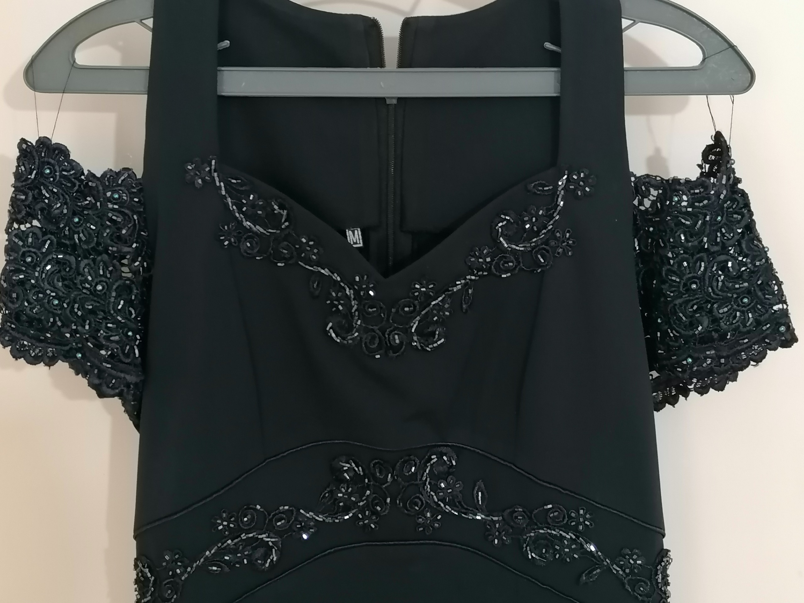 لباس شب ماکسی سورمه ای تیره. یقه دلبری باز و منجوق دوزی با گیپور کار شده تن پوش بسیار زیبا