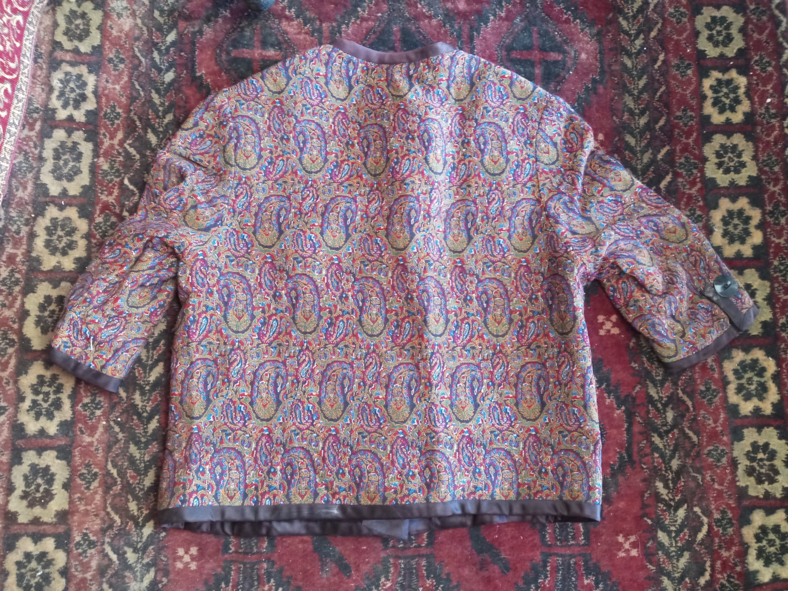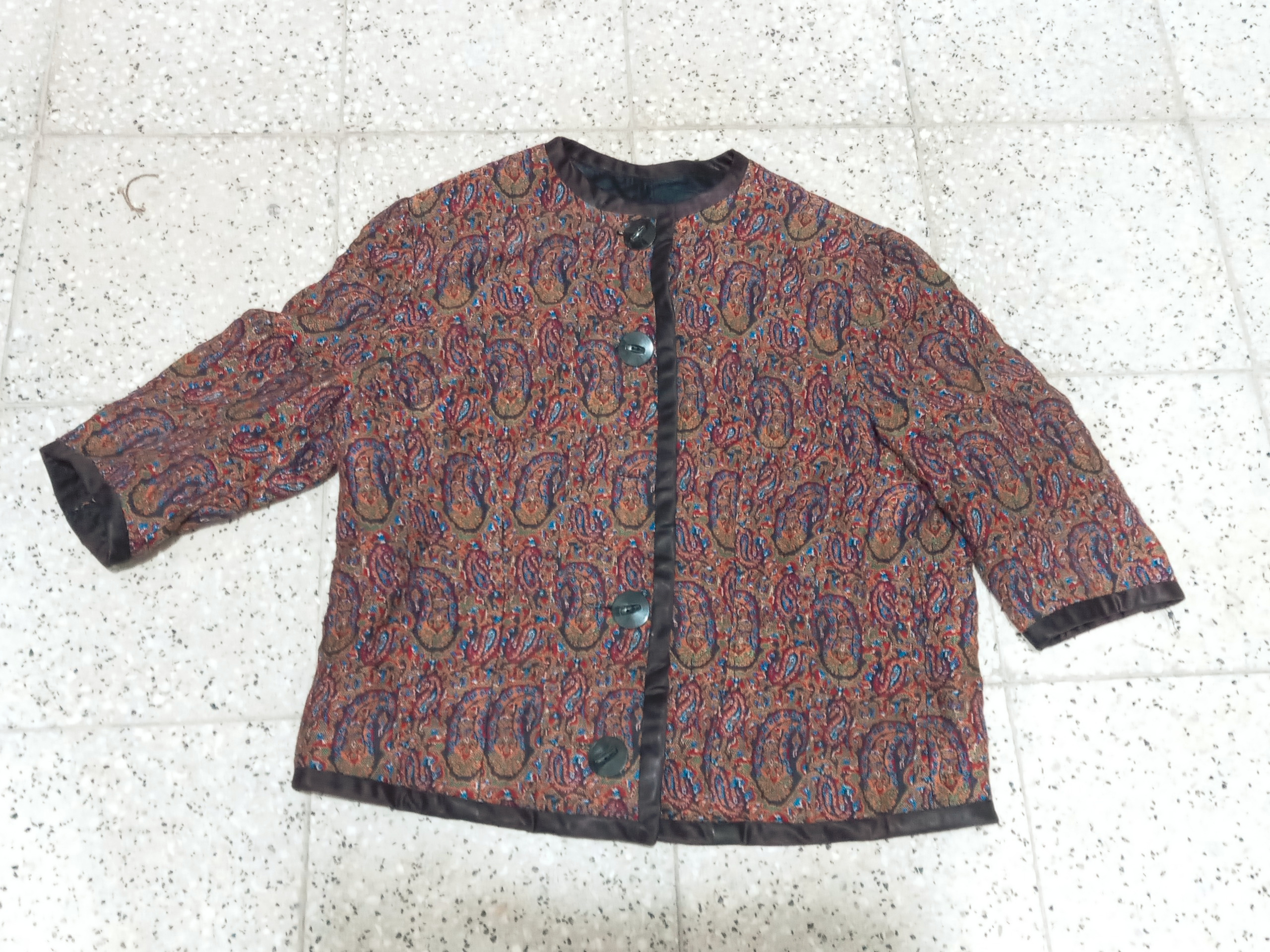 کیفیت مطابق تصویر .قدمت بالای 80 سال .جنس ترمه ضخیم و جوندار کاملا سالم .سایز از یقه تا پایین 53 و عرض 49 سانت .تمام دستساز کاری خاص و نایاب