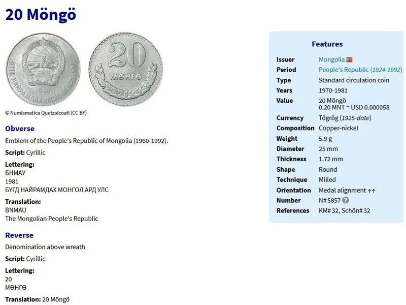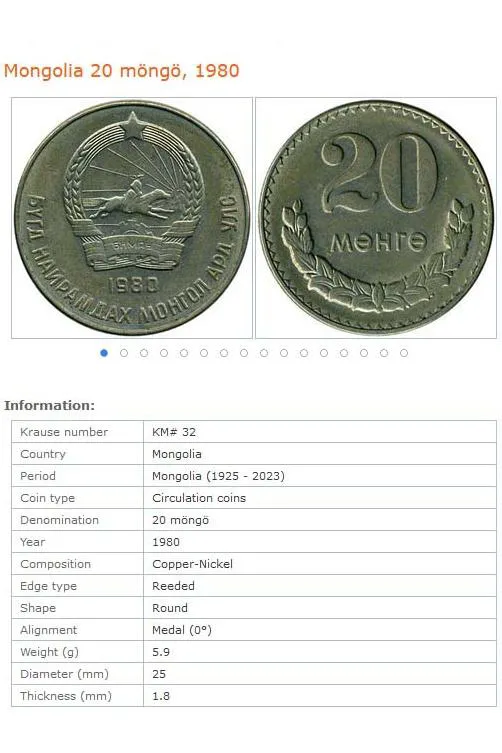 سکه 20 مونگو مغولستان 1980 (نایاب)