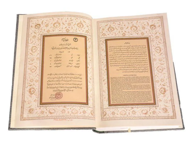 بخط نیریزی خطاط صفویه|کاغذ اعلاء گلاسه |قطع رحلی با چرم مصنوعی وقاب کشویی | وزن 6 کیلو | چاپ مجلس