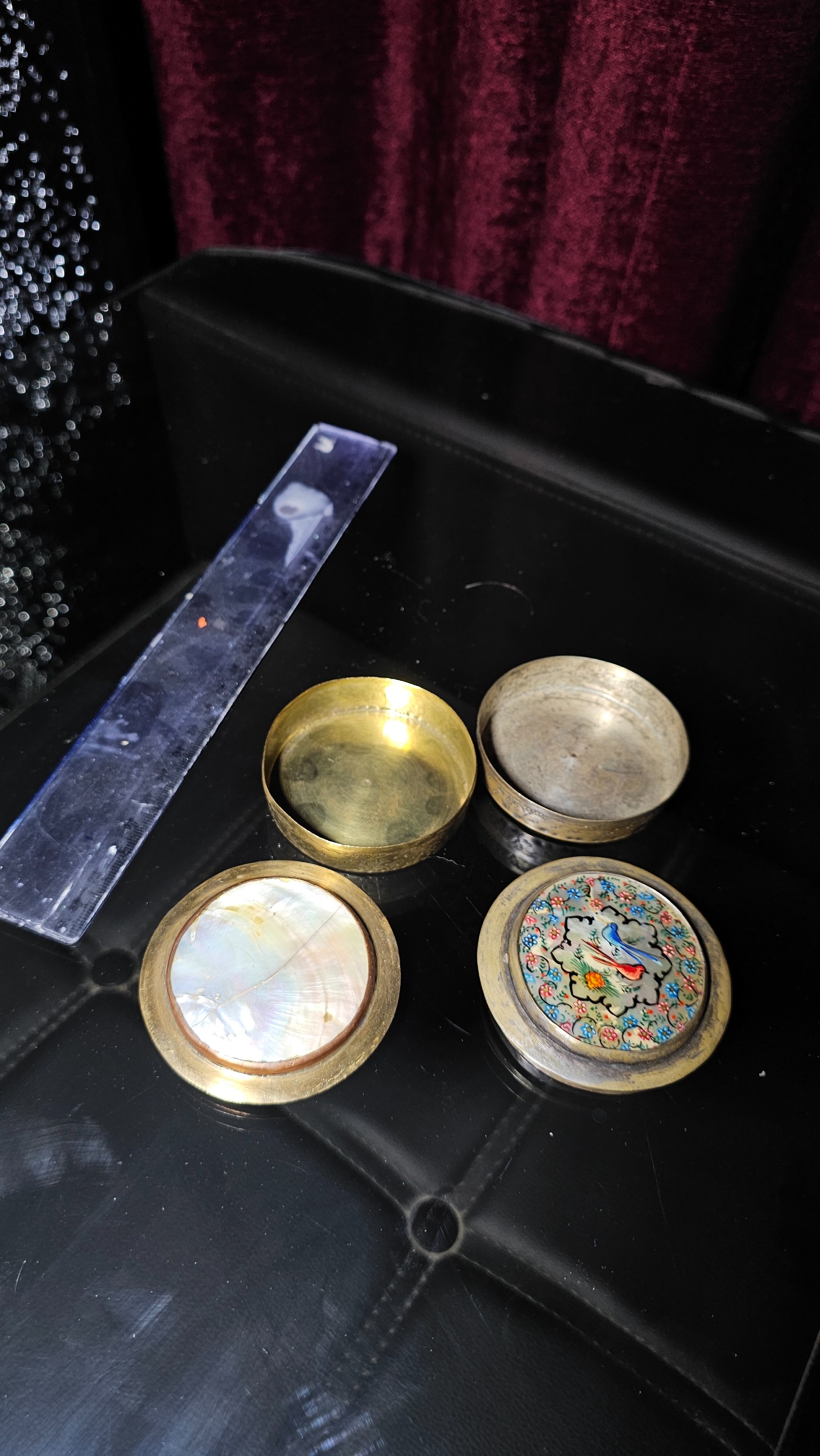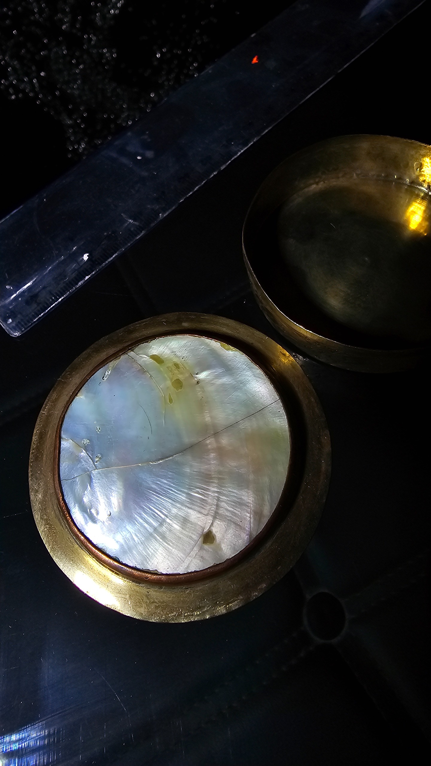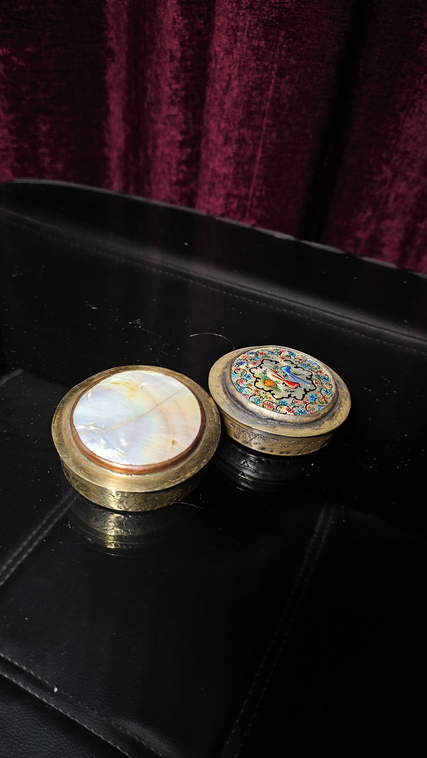 جفت انفیه دان قدیمی یکی با نقاشی خاص قاجاری و یکی صدف ساده هر دو صفحه ها صدف میباشد یکی با نقاشی و یکی ساده که روش یه ترک ریز دارد