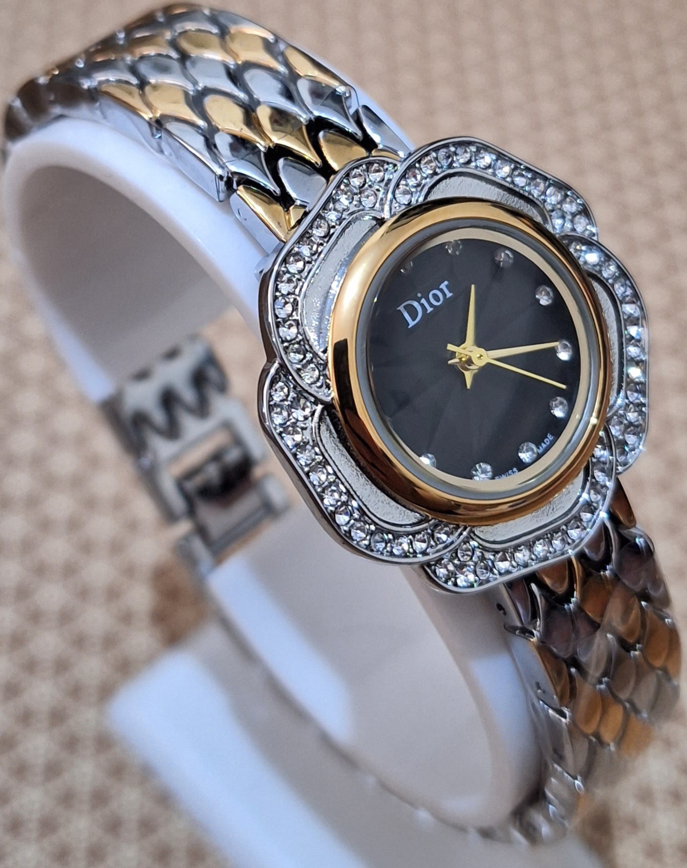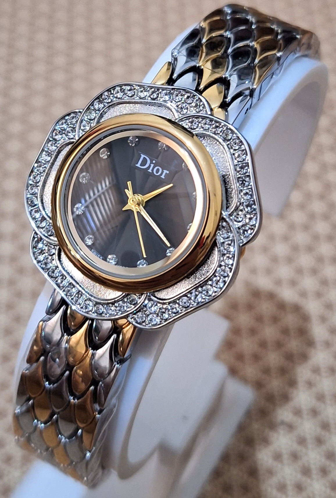 ساعتی فوقالعاده شیک و خاص از برند Dior با صفحه مشکی و قاب گلدار دور نگین، مناسب برای خانمهای شیکپوش و خاصپسند. بدنه فلزی دو رنگ طلایی و نقرهای با کیفیت بالا و جلوه لوکس. ایدهآل برای استفاده روزمره و مجالس. هدیهای متفاوت و خاص برای عزیزانتان.