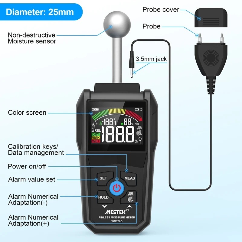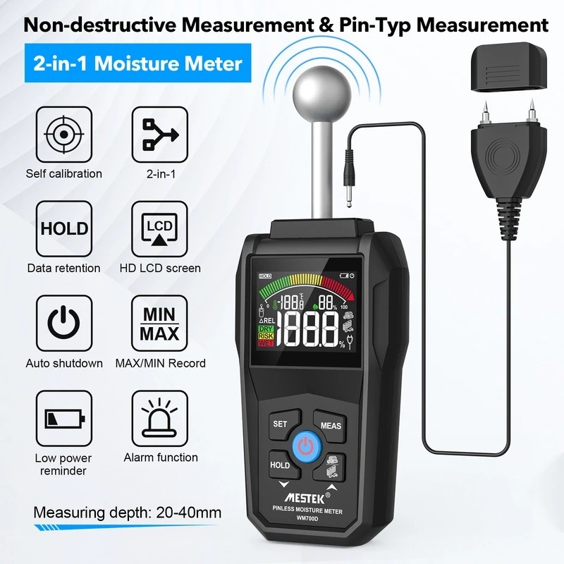 رطوبتسنج MESTEK WM700D یک دستگاه پیشرفته با دو قابلیت اندازهگیری سوزنی و غیرتماسی است که امکان سنجش سریع و دقیق رطوبت چوب، دیوار و مصالح ساختمانی را فراهم میکند. این مدل با نمایشگر رنگی، عمق نفوذ بالا و عملکرد غیرمخرب، انتخابی ایدهآل برای پیمانکاران، کارشناسان ساختمان و صنایع چوب است. طراحی ارگونومیک، خاموشی خودکار و کاربری آسان از دیگر ویژگیهای کاربردی این دستگاه حرفهای هستند.