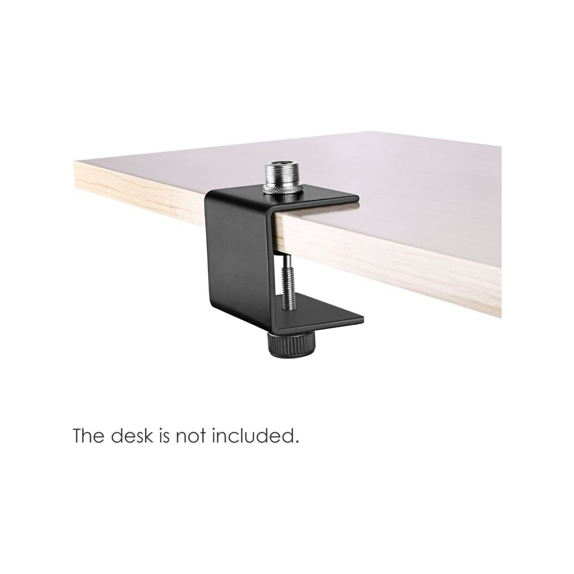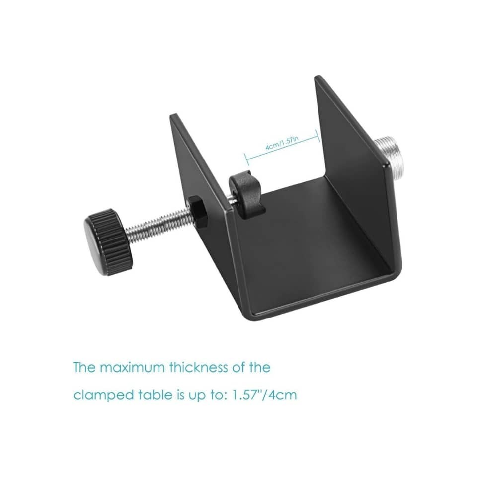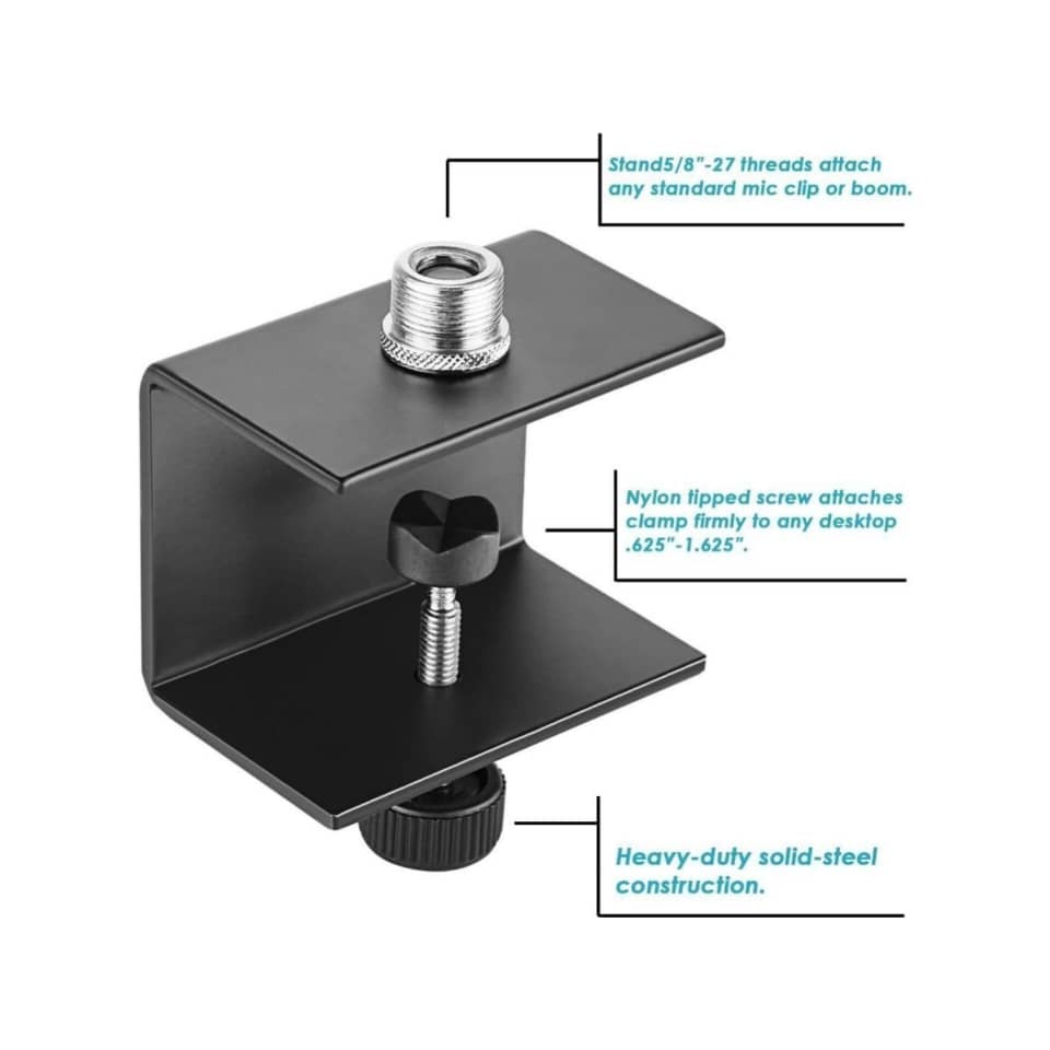 گیره نصب روی میز قابل تنظیم برای نصب ایمن پایه میکروفون شما روی میز یا سایر سطوح صاف با استفاده از یک پیچ موقعیت یابی قابل تنظیم طراحی شده است. * پایه گیره فولادی جامد یک روش محکم و قابل اعتماد برای نگه داشتن پایه میکروفون شما فراهم می کند. پیچ نایلونی از سطح دسکتاپ شما در برابر هرگونه خط و خش محافظت می کند. * می تواند به راحتی بر روی هر دسکتاپ تا ضخامت 1.57 اینچ/4 سانتی متر نصب شود. * گیره نصب C شکل برای برنامه های کاربردی روی میز، مدرسه و رویدادهای عمومی ایده آل است. با این گیره جمع و جور که عملاً همسطح با دسکتاپ شما قرار می گیرد در فضا صرفه جویی می کند. * مناسب برای پایه پایه بازوی بوم میکروفون 5/8 اینچی 27 رزوه ای استاندارد.