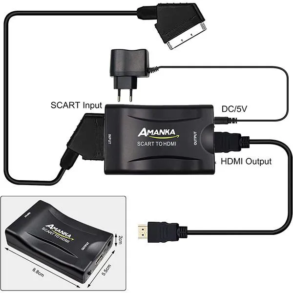 (تبدیل SCART به HDMI) این مبدل Scart به HDMI ویدئوهای دیجیتال HDMI را تبدیل می کند. ورودی از دستگاه های قدیمی با رابط اسکارت مانند ضبط کننده VHS/DVD پشتیبانی می کند. انتهای خروجی از دستگاه هایی با رابط HDMI مانند تلویزیون/پروژکتور پشتیبانی می کند.