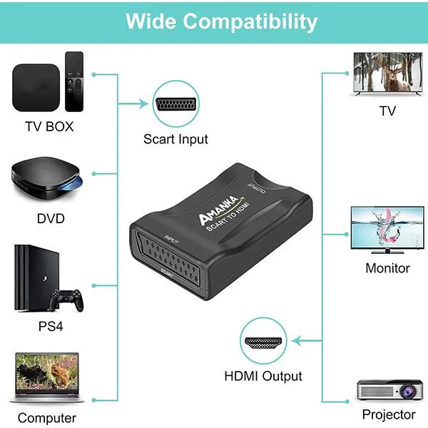 ورودی از دستگاه های قدیمی با رابط اسکارت مانند ضبط کننده VHS/DVD/PS4/TV BOX پشتیبانی می کند. انتهای خروجی از دستگاه هایی با رابط HDMI مانند تلویزیون/پروژکتور پشتیبانی می کند.
