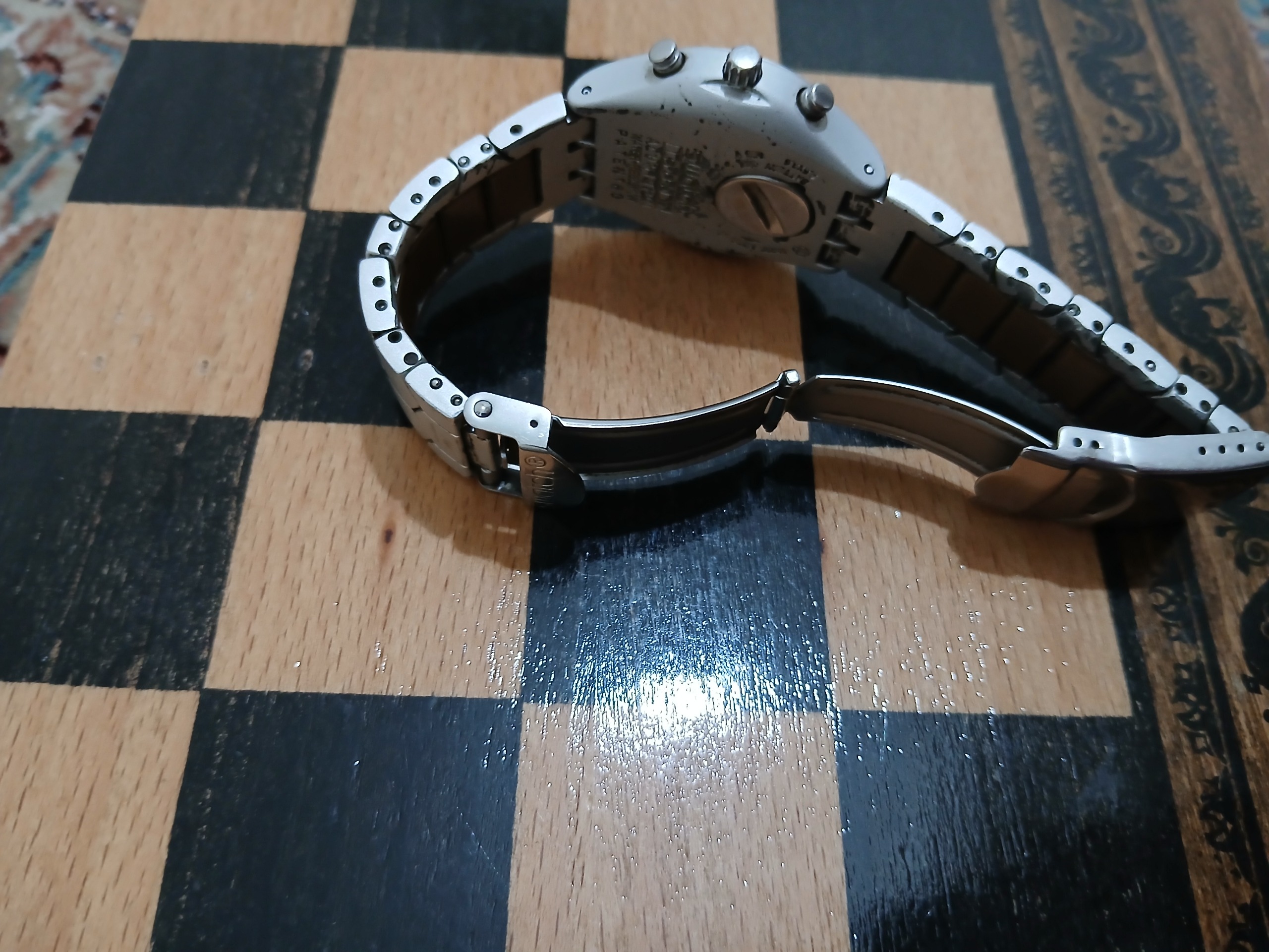 ساعت خیلی وقته، دستمه. زیر ثانیه کار می کنه. خیلی گشتم تا عین خود ساعت را پیدا کنم و قیمت روش بزارم، اما متاسفانه نتونستم. جنس بند نمی دانم نقره هستش و یا آلومینیوم. بندش سبکه، فکر کنم آلومینیوم باشه. طرز چیدمان بند بسیار هنریست. تو دست اصلا سنگینی ساعت احساس نمی شه. خط و خش ندارد. ساعت عالی و کلکسیونی.