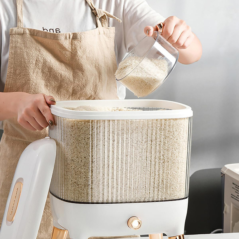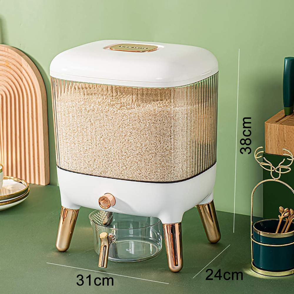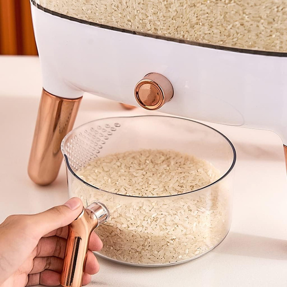 ظرف برنج پایه دار ، محصولی جدید و بدون شک بسیار خاص از نظر ظاهری و البته عملکردی . این کالا به طور کامل تولید شده از جنس پلاستیک فشرده مقاوم و بسیار باکیفیت می باشد که دارای محفظه اصلی با ظرفیت نگهداری 10 کیلوگرم برنج است ، محفظه ای شفاف که قابلیت مشاهده میزان برنج داخل را از بیرون برای کاربر خود فراهم آورده . در قسمت میانی درب اصلی ، محفظه ای تعبیه شده که مناسب برای نگهداری حبه سیر ، گیاه میخک و مواردی مشابه به صورت مجزا ، جهت نگهداری طولانی مدت برنج به دور از آفت می باشد . در قسمت زیرین ظرف برنج ده کیلویی ، چهار پایه تعبیه شده تا ارتفاع مناسبی میان خروجی برنج و سطح زیرین ایجاد کند ، بنابراین به سادگی می توانید برنج را به میزان دلخواه و البته با استفاده از پیمانه منحصر به فردی که همراه کالا است بردارید . یک پیمانه دسته دار کاملاً شفاف با لبه آسان ریز و البته صافی شکل که امکان آبکش کردن برنج متناسب با ظرفیت محفظه خود را به کاربر خواهد داد . یکی از ویژگی های جذاب باکس برنج پایه دار ، نوع خروجی آن است که در قسمت زیرین محفظه اصلی تعبیه شده و با استفاده از یک دکمه طراحی شده در قسمت جلو ، امکان برداشت برنج از داخل محفظه بدون نیاز به باز کردن درب اصلی را برای کاربر به میزان نیاز را فراهم آورده . از ظرف برنج دکمه ای می توانید بر روی میز آشپزخانه و یا کابینت خود استفاده کنید تا در عین ایجاد جذابیت ظاهری برای محیط داخل آشپزخانه ، همواره برنج را در دسترس شما قرار دهد .