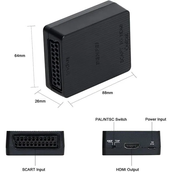 - طراحی قابل حمل: آداپتور قابل حمل یک دستگاه SCART Composite AV/S-video را به HDTV، مانیتور یا پروژکتور با ورودی HDMI متصل می کند. یک کابل HDMI (فروش جداگانه) مورد نیاز است.