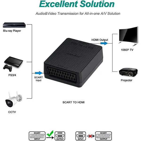 - سازگاری جهانی: این آداپتور SCART به HDMI از وضوح تا 1920x1080esam60Hz و 720P پشتیبانی می کند. و با HDTV، پخش کننده DVD، STB، PS3 و سایر دستگاه های دارای خروجی SCART کامپوزیت استاندارد سازگار است.