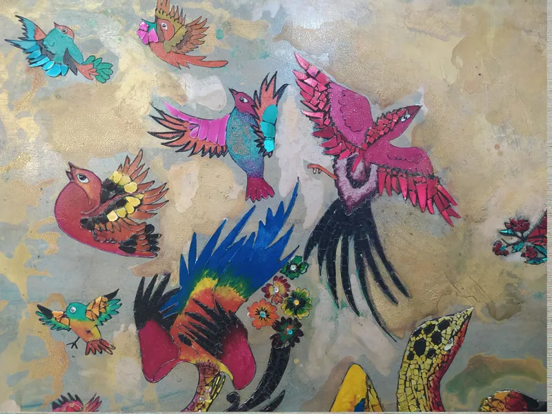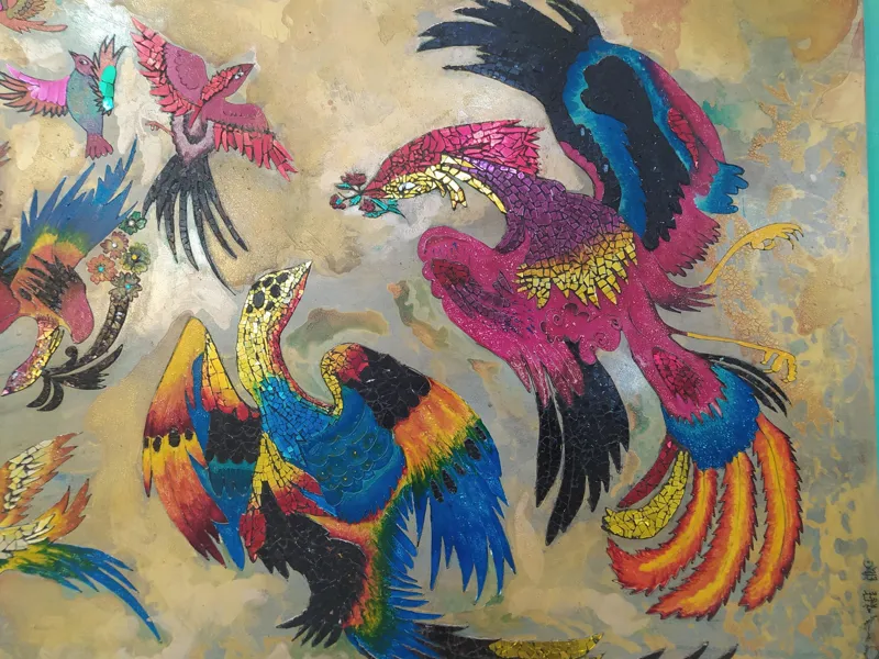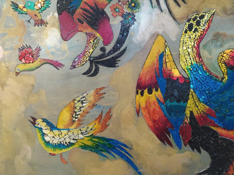اثر ققنوس تکنیک ویترای با تلفیق آیینه رنگی روی قاب ام دی اف متشکل از حدود 3600 قطعه آیینه و رنگهای ترکیبی پتینه ،ویترای،اکرولیک