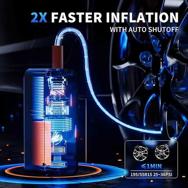 بادکننده تایر قابل حمل ما، با یک تراشه 3*2600 میلیآمپر ساعت و موتور قدرتمند، 150 PSI و 27 لیتر در دقیقه جریان هوا میدهد. این دستگاه میتواند یک تایر 195/55 R15 را از 0 تا 36 PSI در 6 دقیقه باد کند و تنها در 1 دقیقه از 29 به 36 PSI افزایش یابد. علاوه بر این،