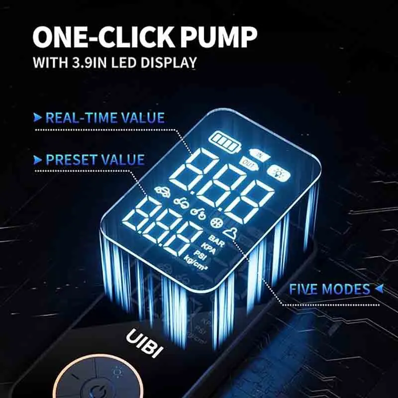 پمپ باد ما را با کارایی از طریق پنج حالت از پیش تعیین شده برای نیازهای مختلف (دوچرخه، موتورسیکلت، ماشین، توپ و سفارشی) و چهار گزینه (PSI، KPA، BAR، KG/CM²) ترکیب میکند. این پمپ شامل یک فشارسنج تایر در لحظه برای کنترل دقیق باد است. فقط حالت را انتخاب کنید