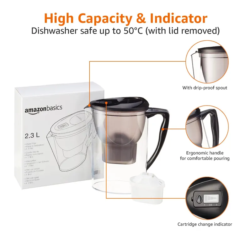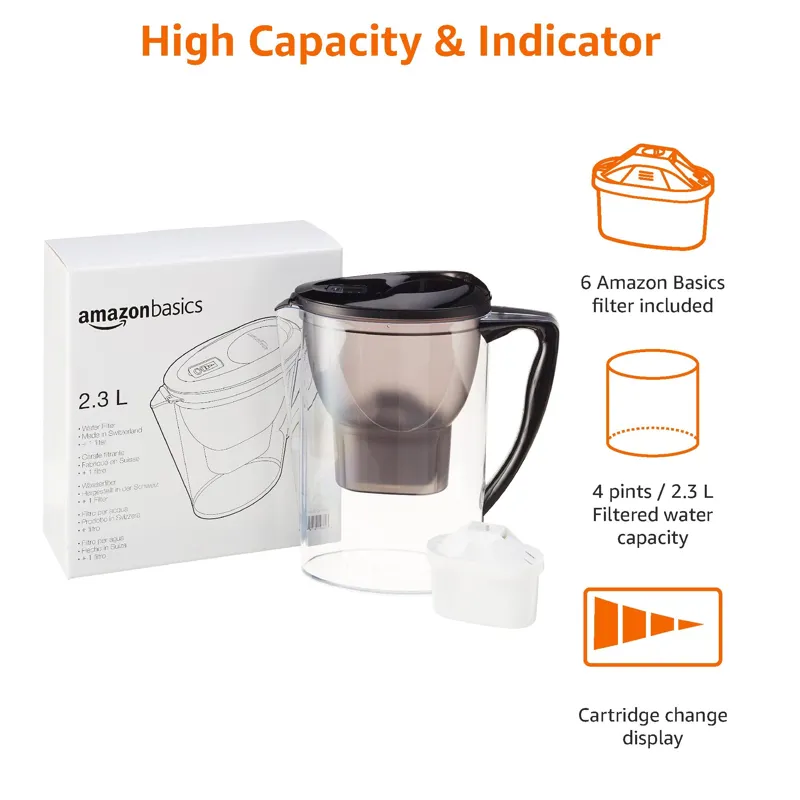 پارچ  فیلتر آب Amazon Basics 2.3L (4 Pint) با کارتریج 1x30 روزه، بدون BPA، مشکی