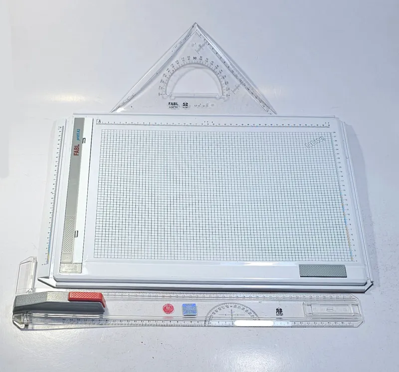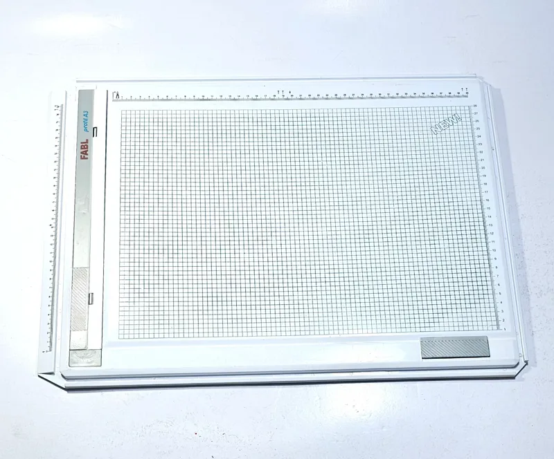 تخت رسم فابل با کیفیت عالی مدل profil A3 به همراه گونیا فابل با کیفیت عالی ، تخت رسم کاملا سالم هست فقط یکی از گیرهای روی خط کش کنده شده که با فلش مشخص شده است