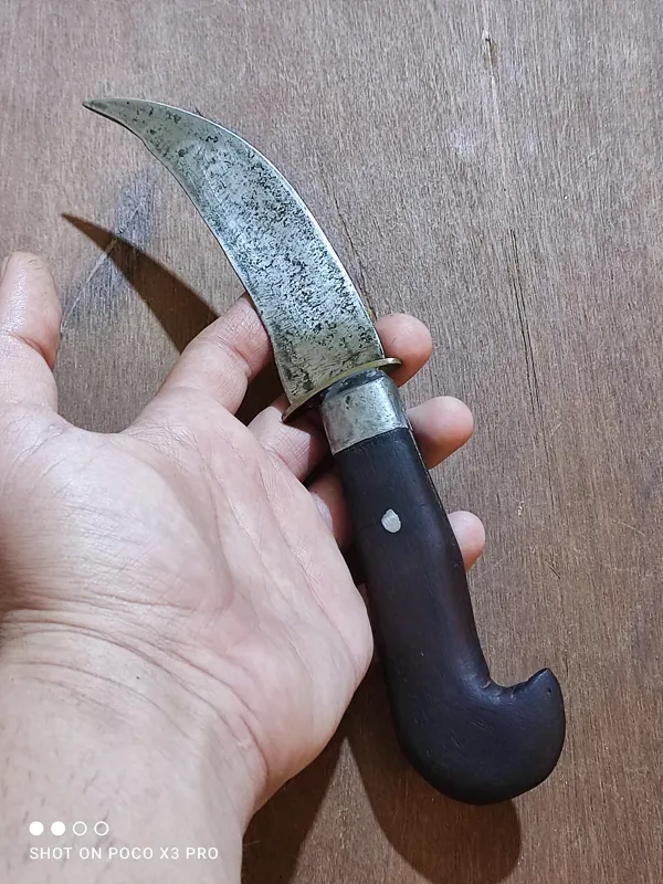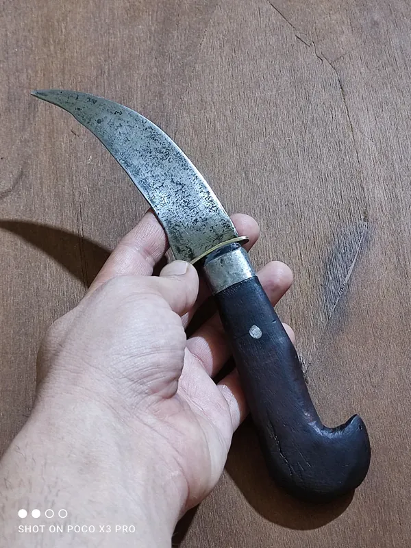 چاقوی کهنه و بسیار زیبای قاجاری کاملا کهنه و بااصالت این مدل چاقو معروفه به شترکش تیغه فولاد دسته از چوب بسیار محکم بالای 90 سال قدمت این چاقوه تیغه جوهردار چاقویی که تیغش جوهرذار میشه نشونه قدمت خیلی زیادشه چوبش چوب قرمزه که خیلیم باارزشه و بی نهایت محکم و جوندار فکنم کهور باشه اسم این مدل چوب