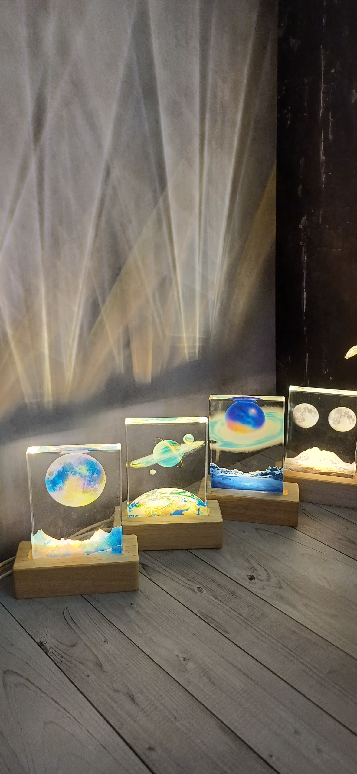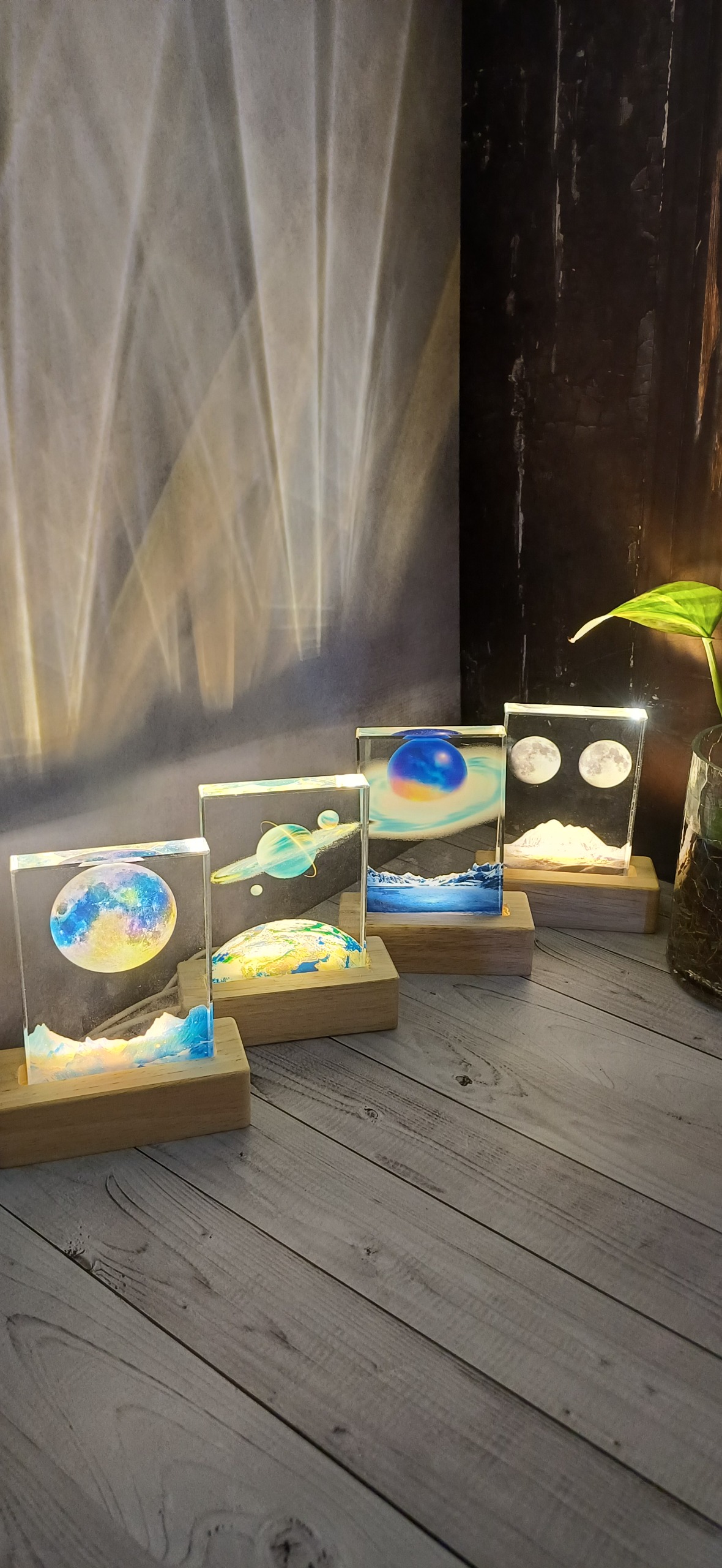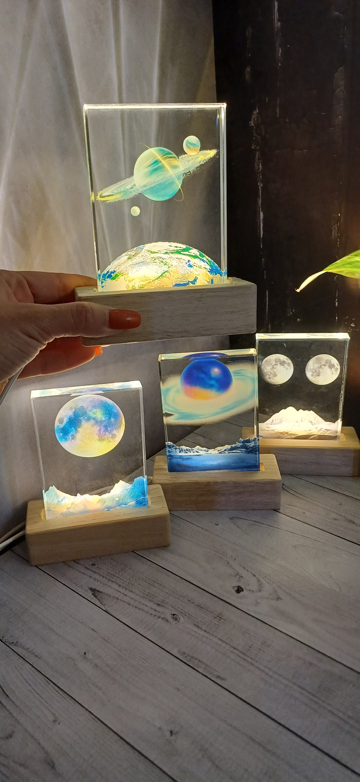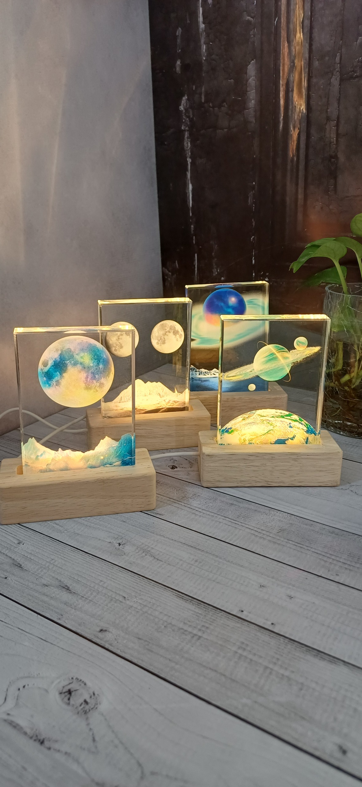 چراغ خواب شیشهای فضایی با پایه چوبی، یک چراغ خواب تزئینی است که از یک گوی شیشهای با طرحهای فضایی (مثل ماه، سیارات، یا فضاپیما) و یک پایه چوبی تشکیل شده است. این چراغ خوابها معمولاً دارای نور ملایم و گرم هستند که توسط LEDهای داخل پایه ایجاد میشود و از طریق کابل USB تغذیه میشوند.