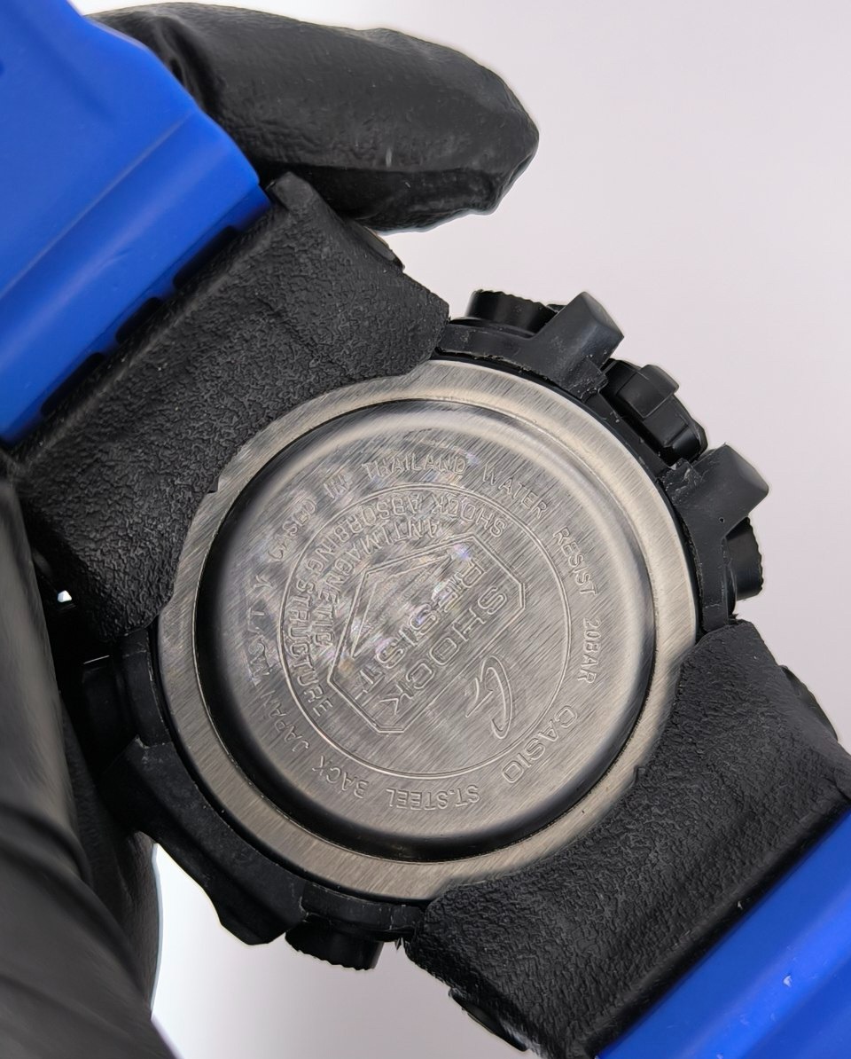 بند رابر آنتی آلرژی و قاب و قفل استیل ضد زنگ، همراه با صفحه ضدخش و مقاومت بالا در برابر ضربه و آب، دوام و راحتی بینظیری را رقم میزند. حکاکی پشت قاب و نمایش کامل تاریخ (سال ماه و هفته) جلوهای خاص به این ساعت داده است. ساعت مچی کاسیو طرح جی شاک آبی را میتوانید