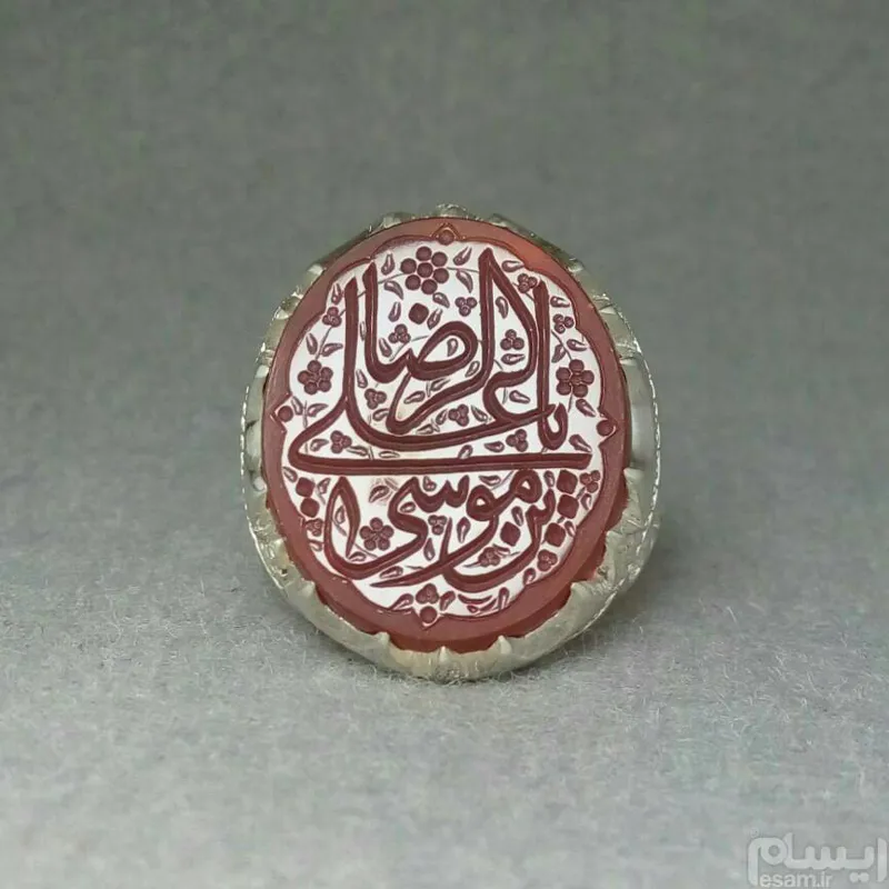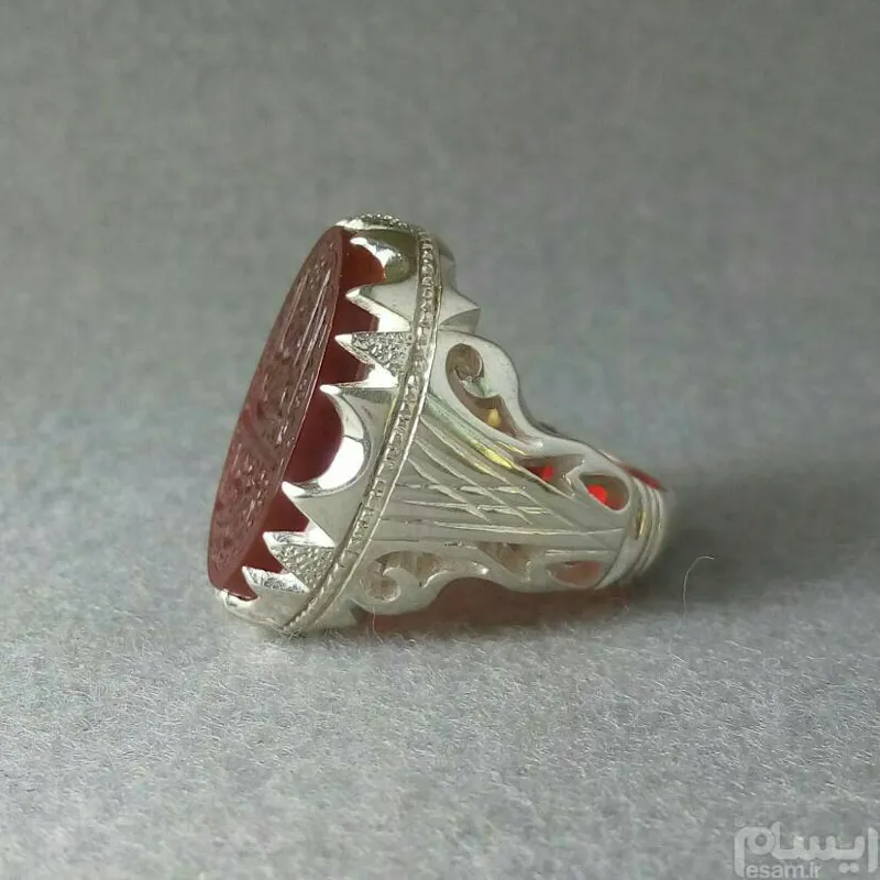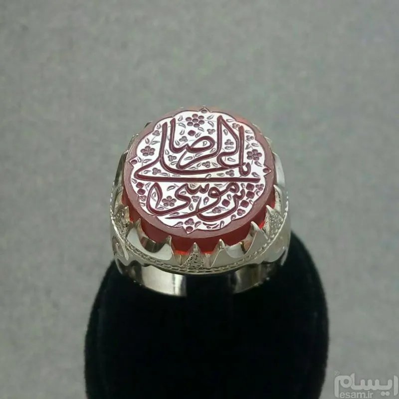 عقیق سرخ خوشرنگ خطی درشت حکاکی عمیق دستی با تذهیب بسیار زیبا، مزین به؛ یا علی ابن موسی الرضا ع... بسیار خوش خط، با امضای استاد رَب. پشت نگین تراش برجسته، پشت تراش. رکاب جوندار و ضحیم دورچنگ زیبا، مدل خاص تلفیقی، حصیری_شبکه، شش چنگ سندبلاست پیکور شده. عیار استاندارد 925 سایز رکاب 63-64 اثری فاخر، شکیل و بینقص