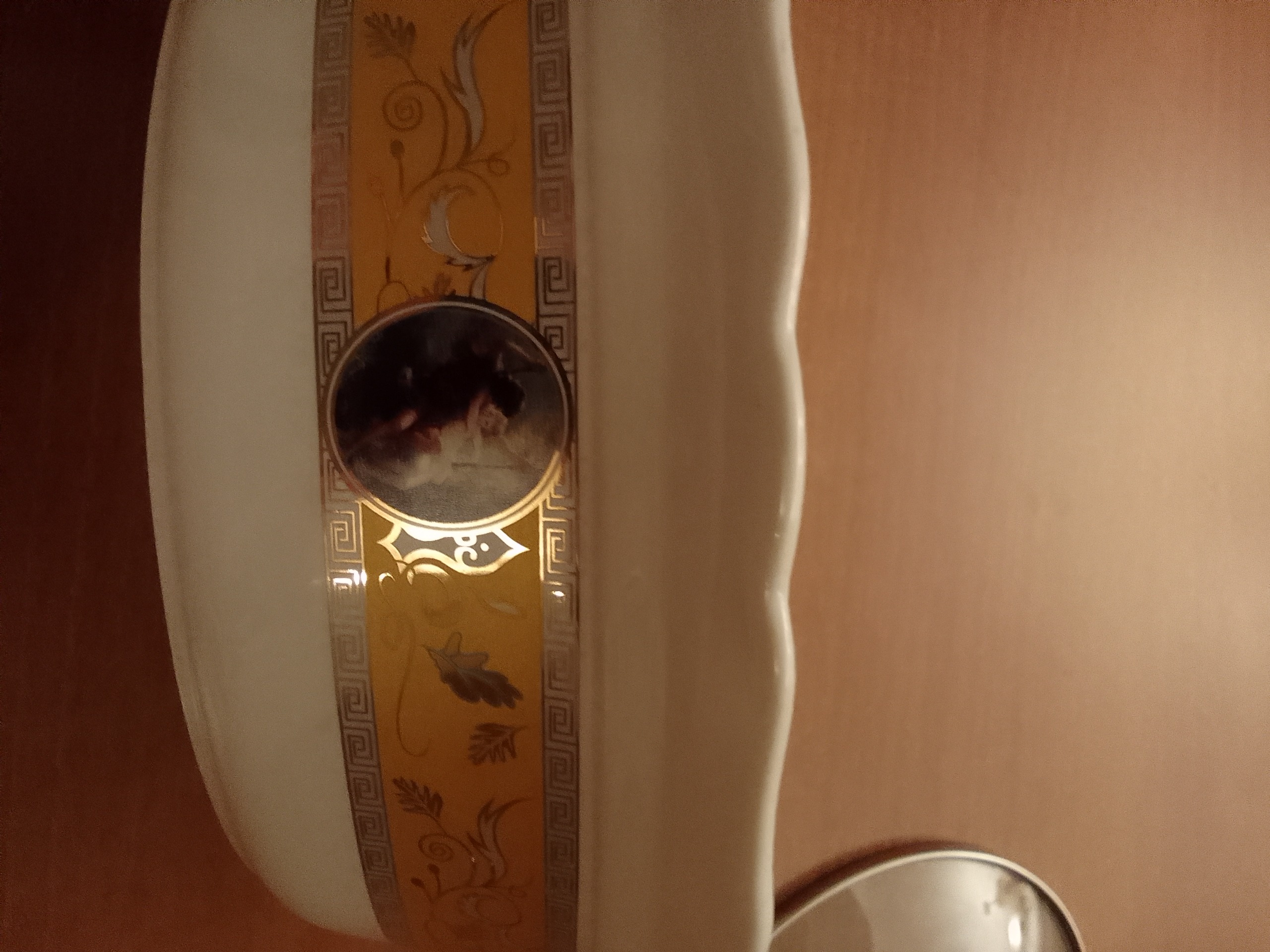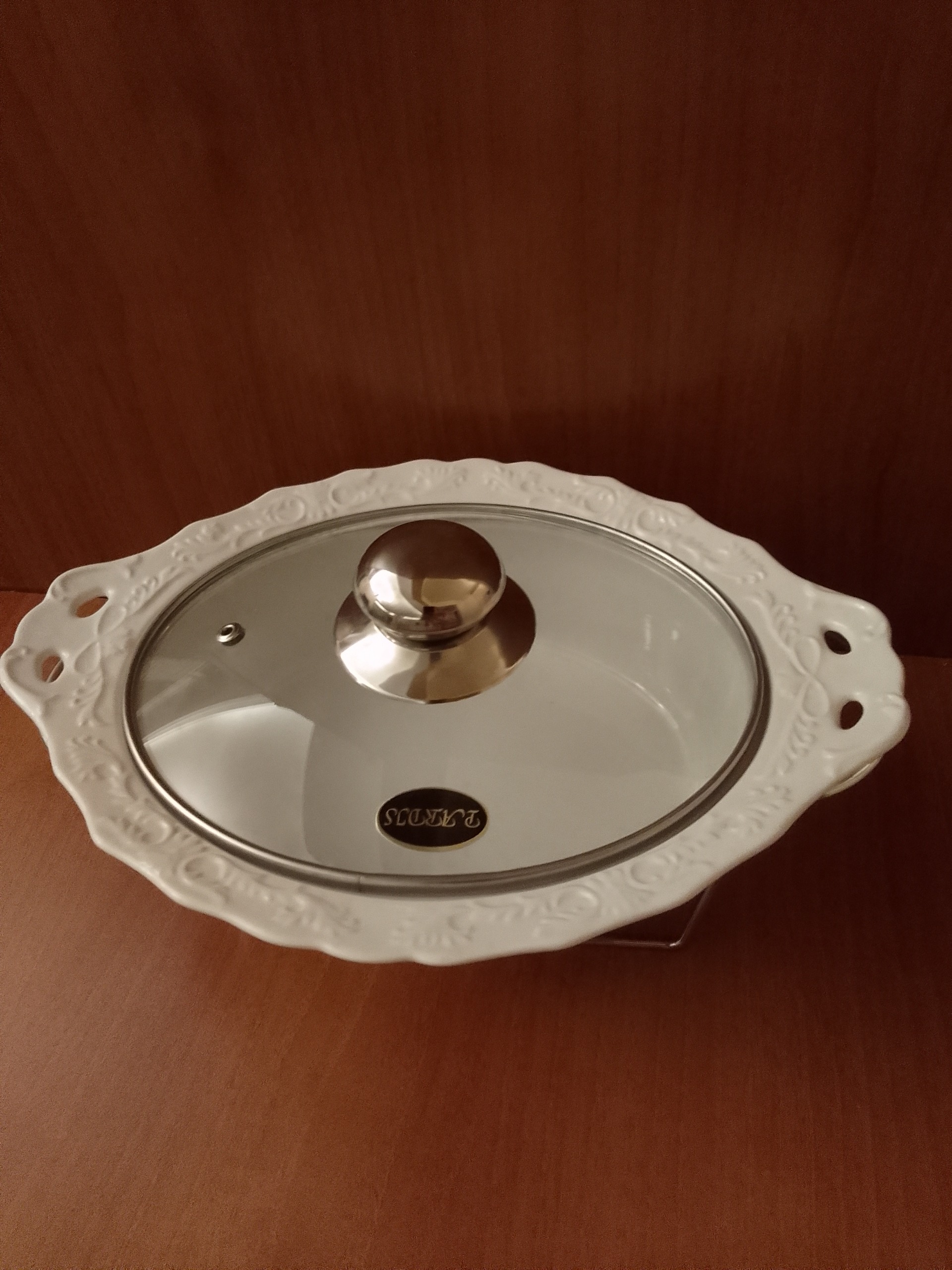 سوفله خوری چینی بیضی ظرف وارمر دار سفید طلایی