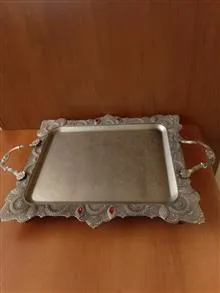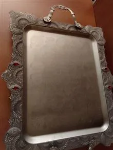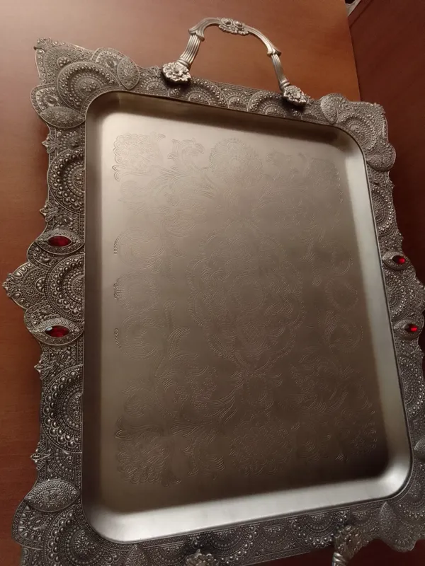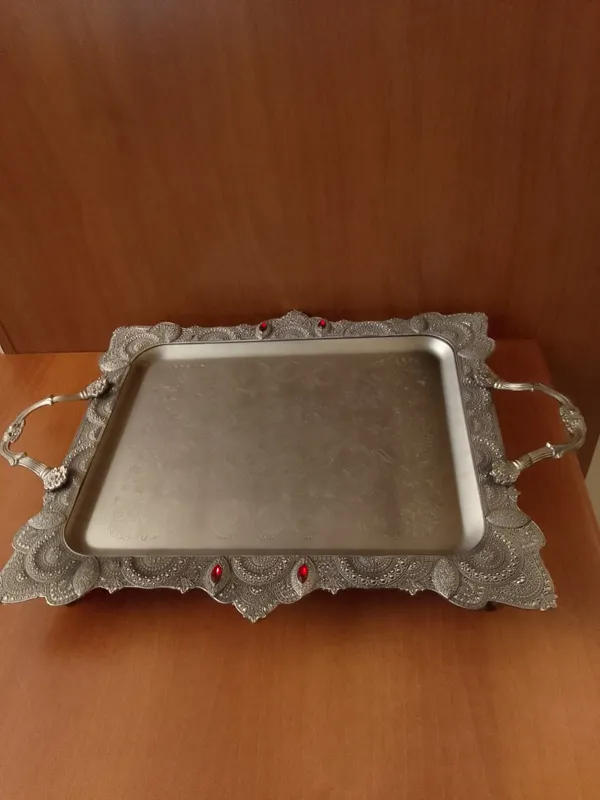 سینی مستطیل بزرگ نقره ای نگین قرمز نقش و نگار دار پایه دار دسته دار ابعاد 40در30