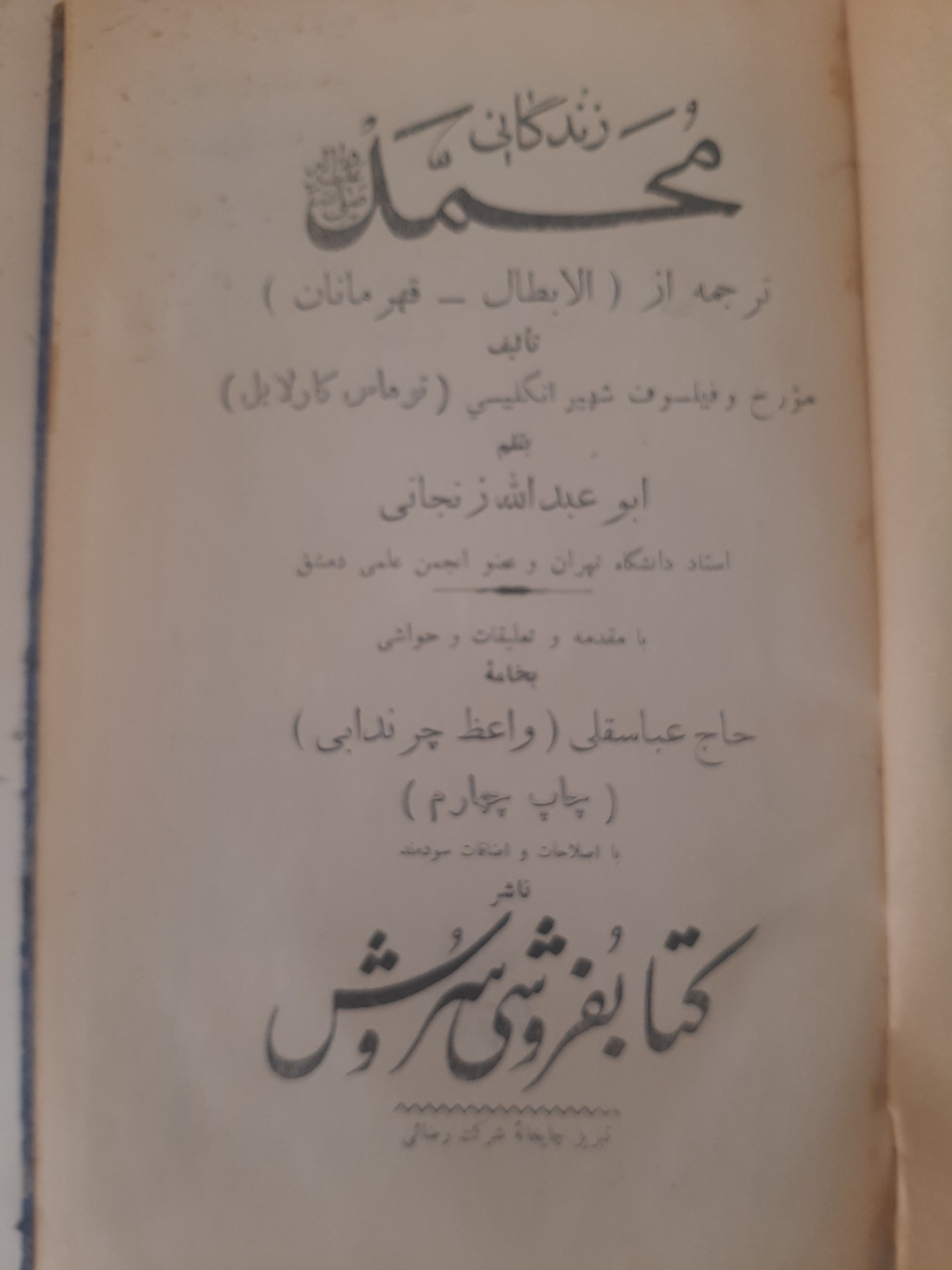 زندگانی محمد - تالیف : توماس کارلایل - مترجم : ابو عبدالله زنجانی - نشر تبریز چاپخانه شرکت رضایی - چاپ سال 1318 ش - رقعی - گالینگور - 116 ص