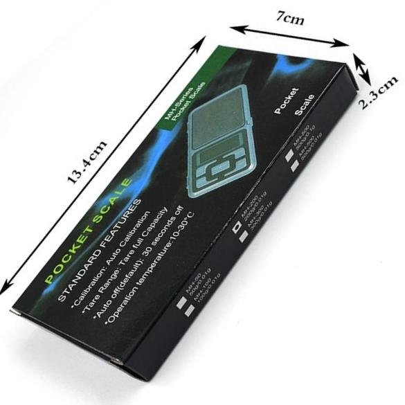 برندPocket Scaleسایز دستگاه120*20*62 میلیمترسایز کفه50*56 میلیمترمنبع تغذیه2 باتری 1٫5 ولتصفحه نمایشLCDخاموش شدن خودکارپس از 30 ثانیه