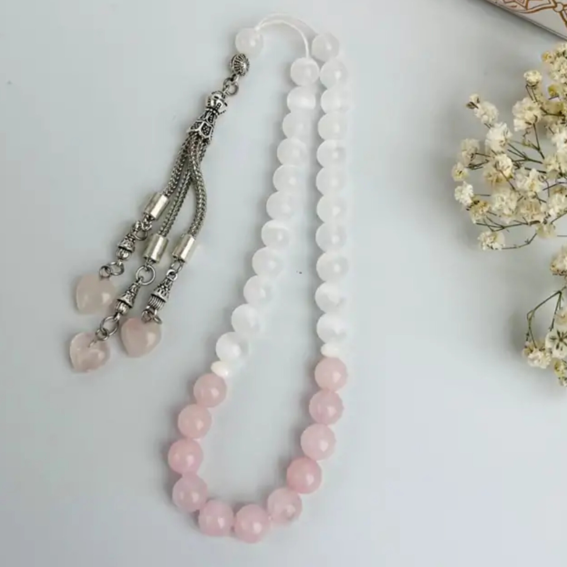 این تسبیح زیبا با ترکیب دلنشین سنگهای رز کوارتز و مون استون، نمادی از عشق درونی، آرامش ذهن و تعادل احساسی است.