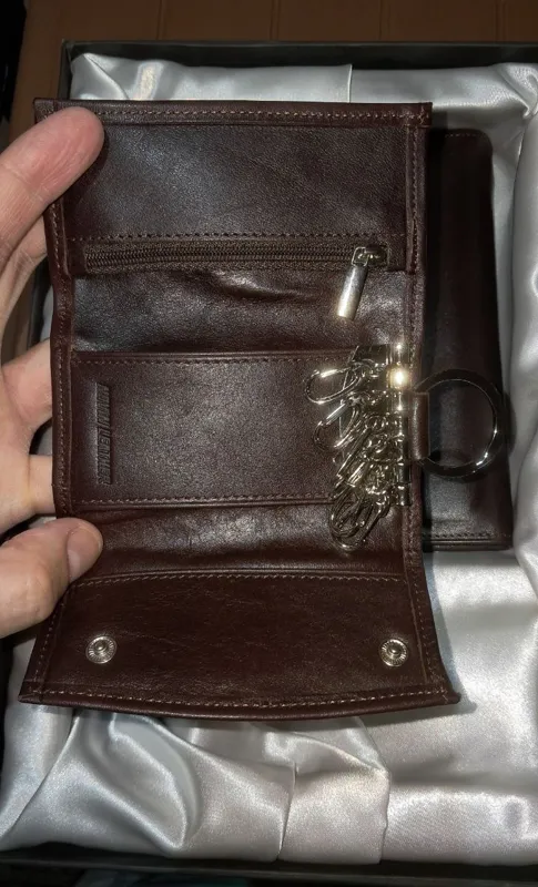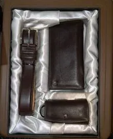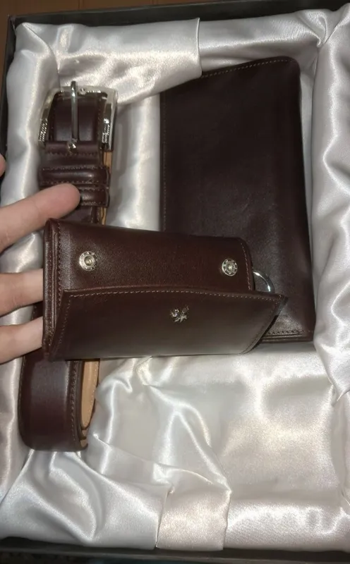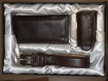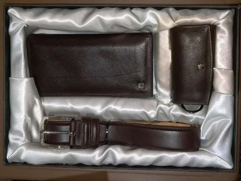 شامل کمربند، کیف پالتویی و جا کلیدی. داخل جعبه ی اصل و زیبا با لوگو نوین چرم.
