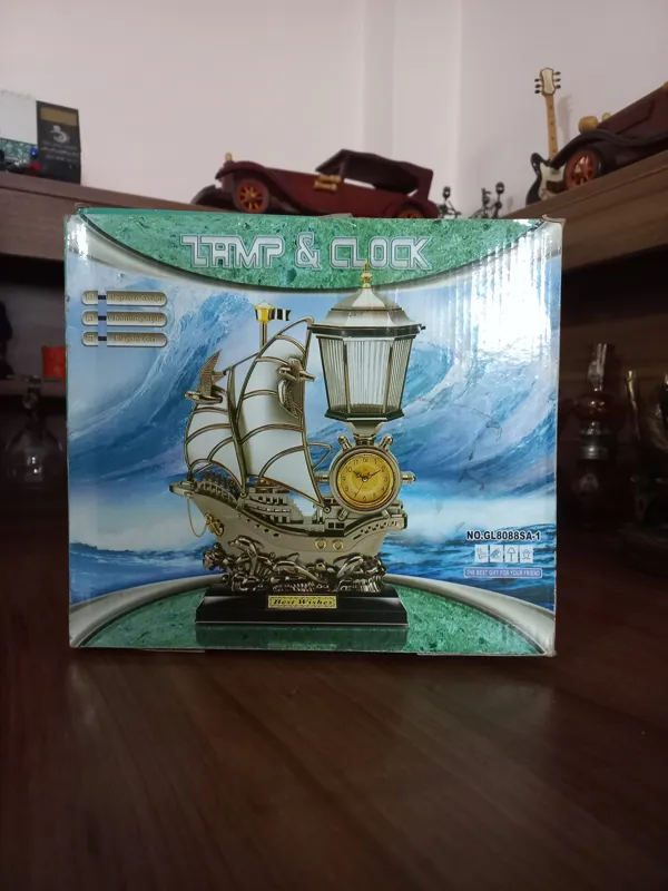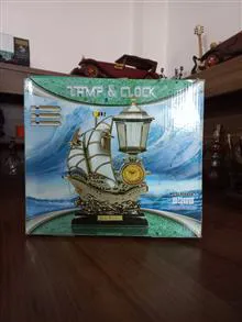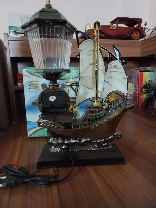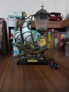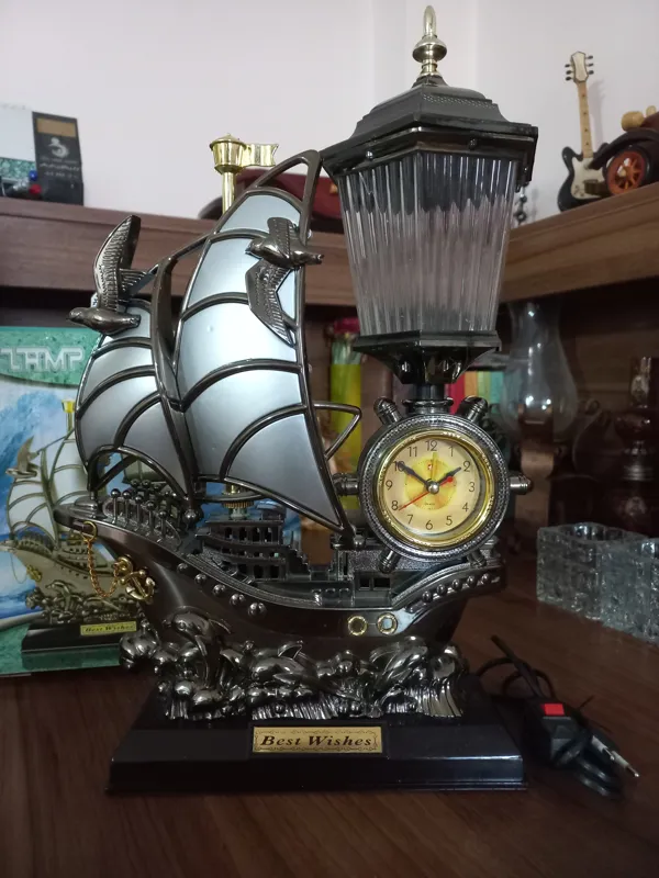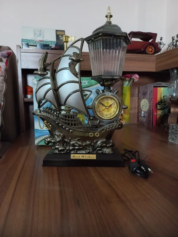 چراغ و آباژور و ساعت زنگ دار سالم طرح کشتی بادبانی دکوری زیبا. باتری ولامپ ندارد از مبلغش کم کردم.