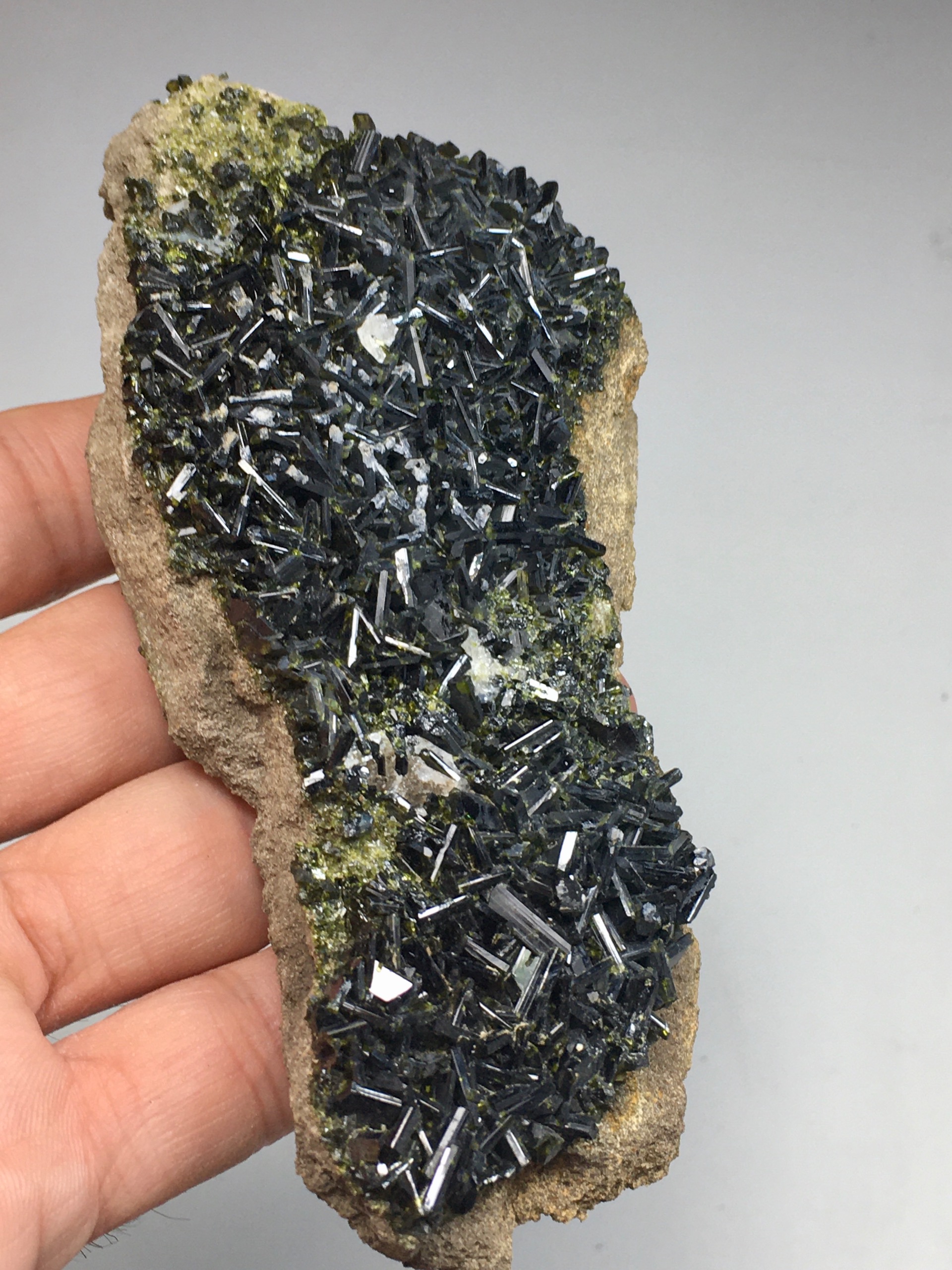 نمونه ای بی بدل وبی نظیر فوق العاده زیبا مناسب کلکسیون یکی از زیباترین کانی های ایران معروف به الماس سیاه ایران قطعه نسبتا درشت مقیاس کف دست مشخص است و کوچک نیست دانه ریز کمیاب