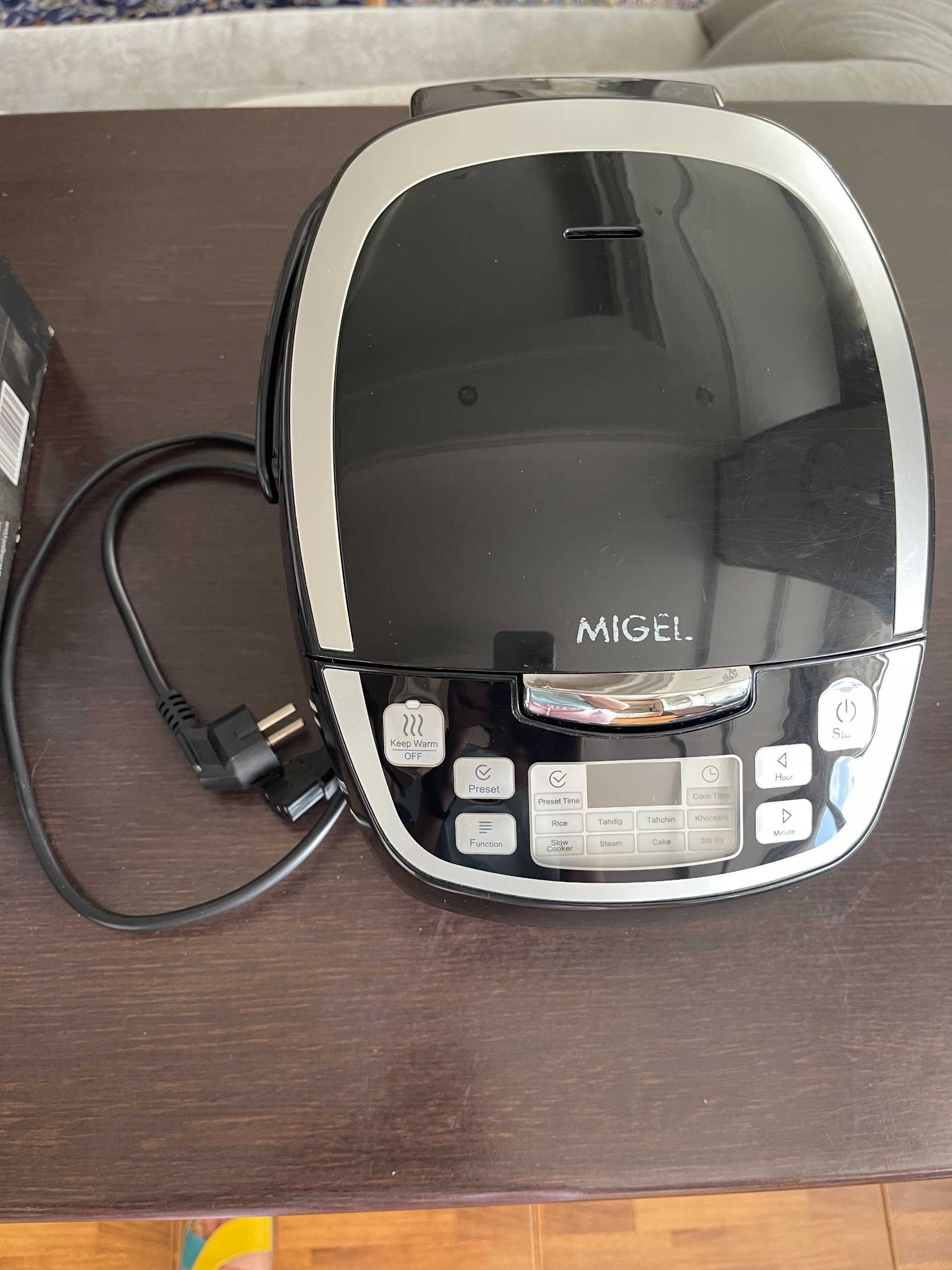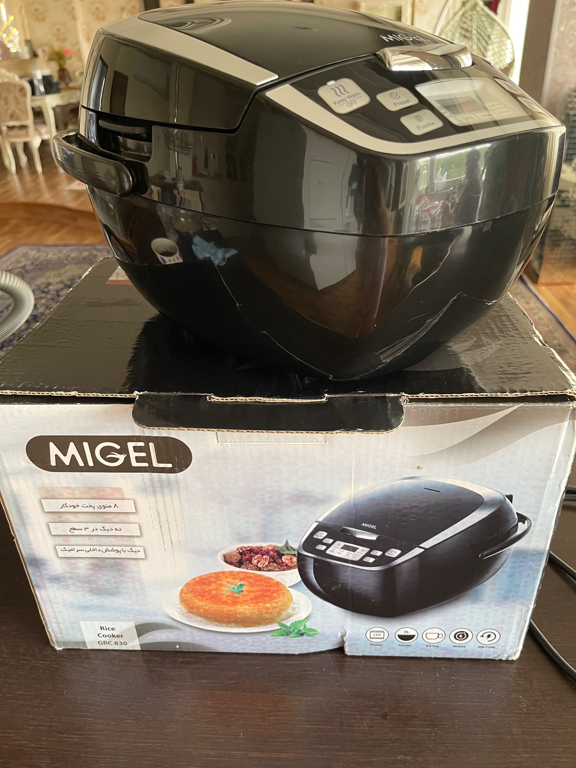 این پلوپز چندکاره میگل هست.خیلی خیلی کم استفاده شده از تمیزی و سلامت قابلمه تفلونش مشخصه.قوطی و بدنه کامل کامل سالم.ولی خانواده ما پلوی پلوپزی رو دوست نداشتن و استفاده نشد.برنامه پخت خورشت و کیک و غیره هم داره