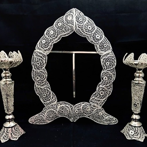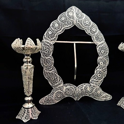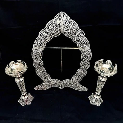 ظروف ملیله کاری قاب بیضی شماره پنج و شمعدان قلمی
