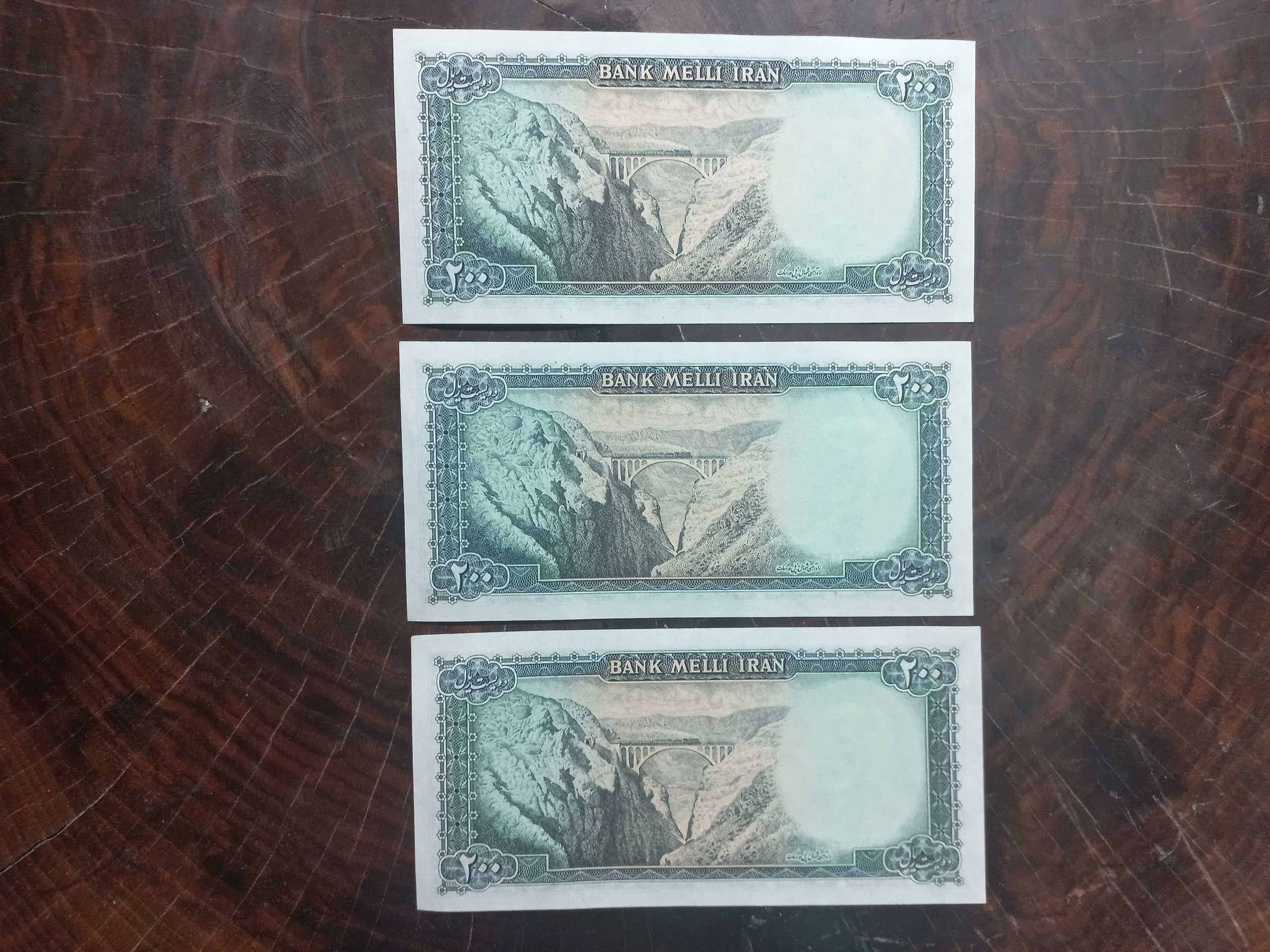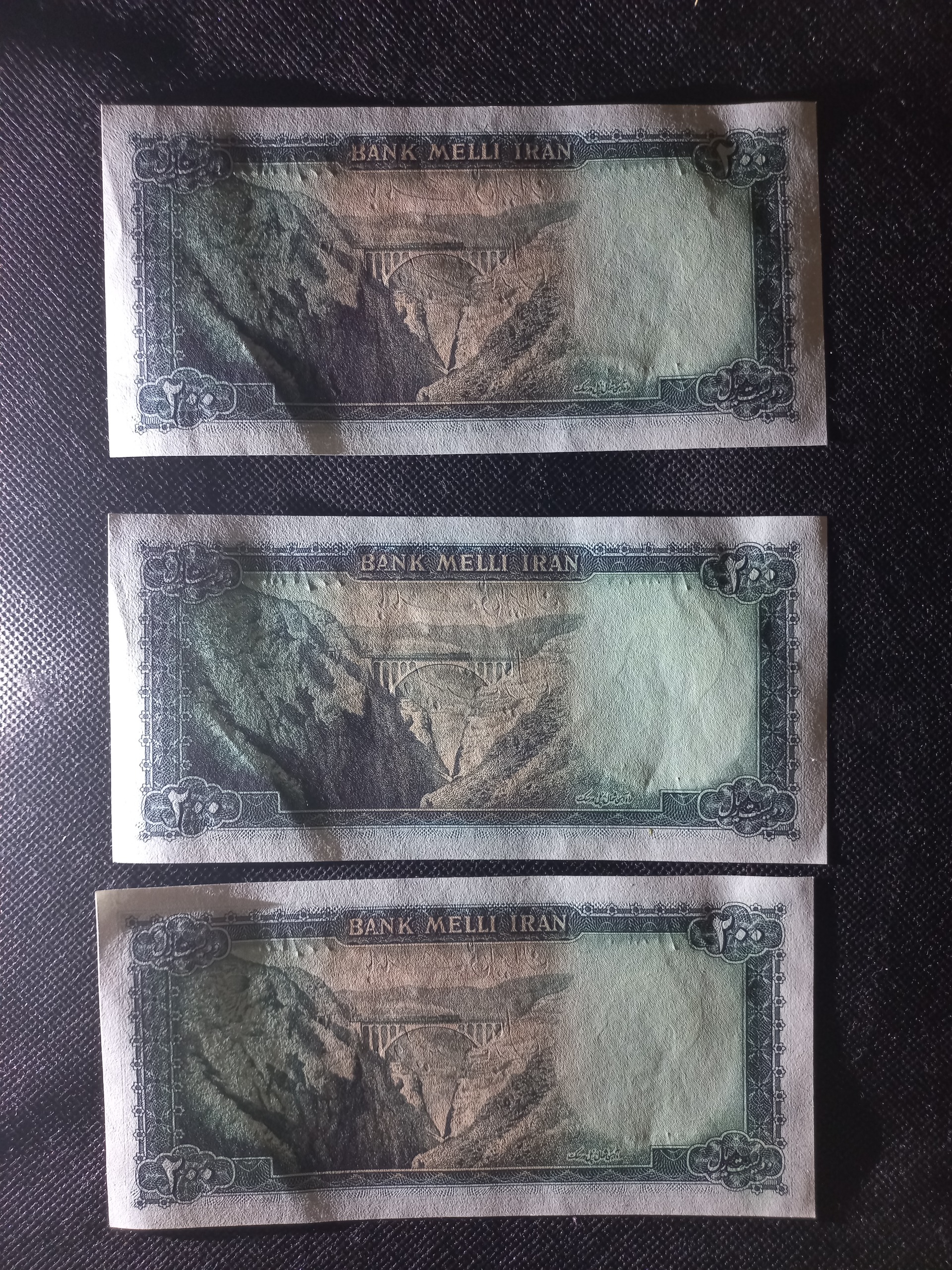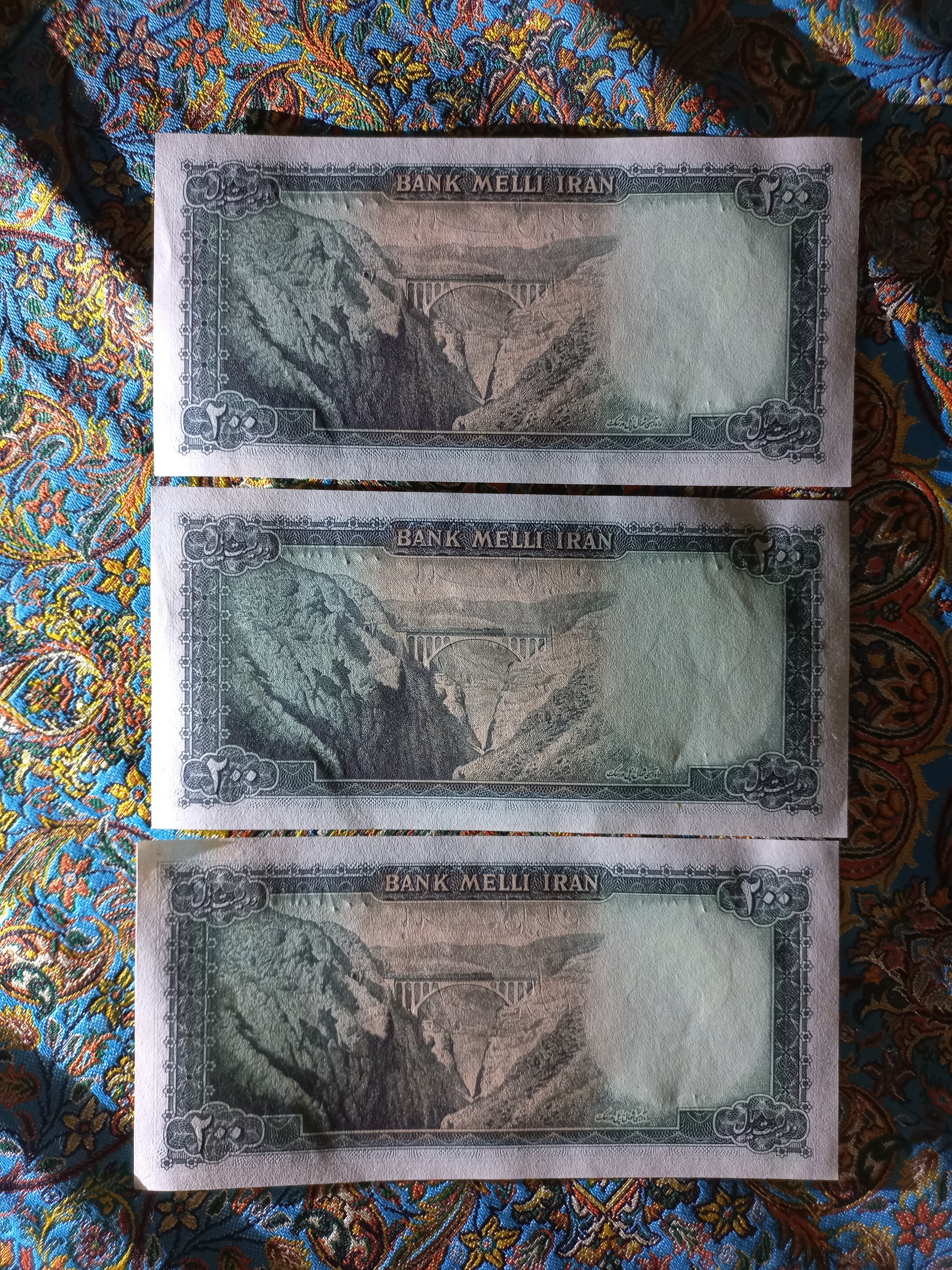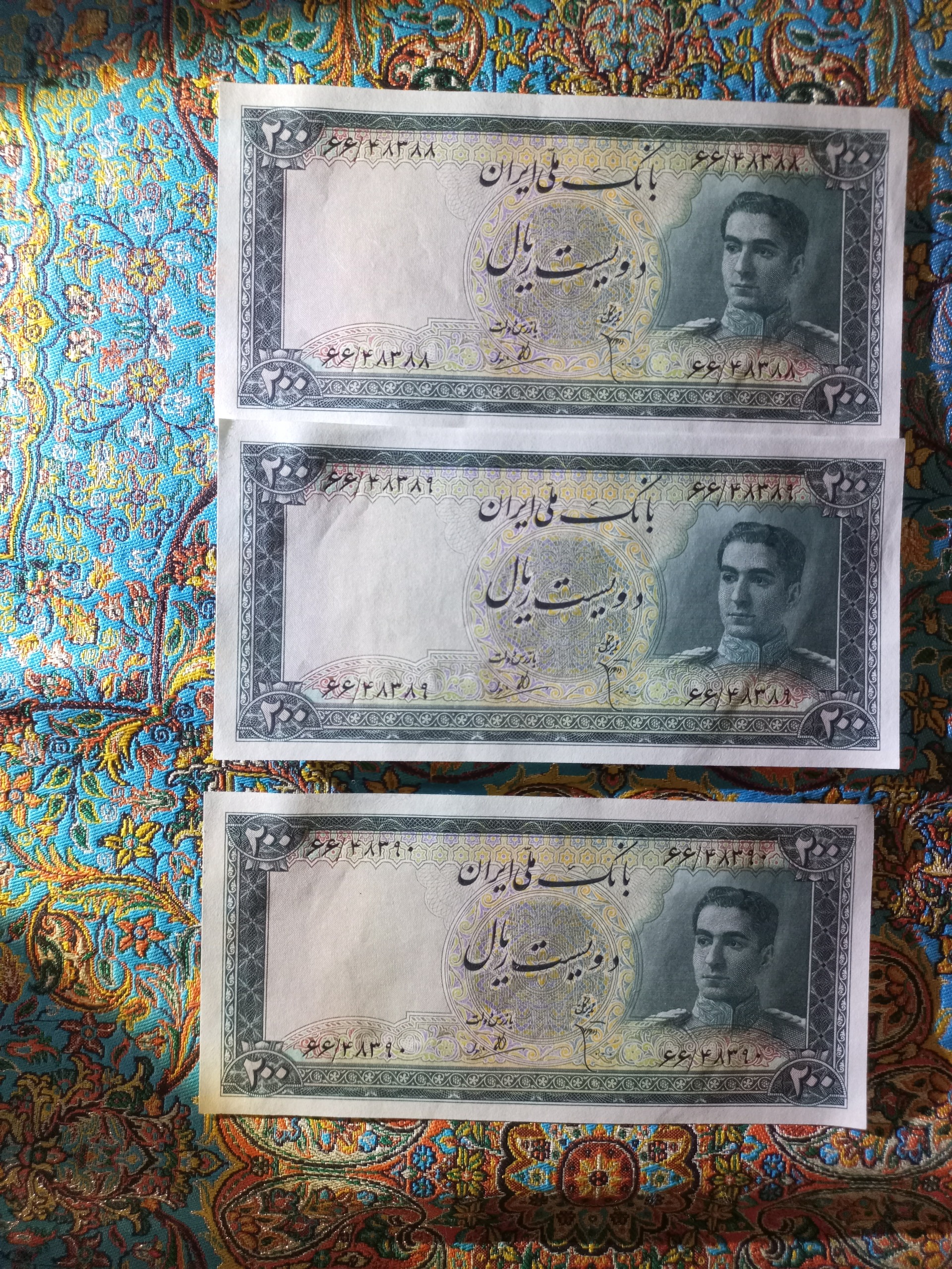 *********** اسکناس 200 ریالی سری سوم به صورت 3 برگه با شماره سریال پشت سر هم، کیفیت بانکی است اسکناس ها دارای شکستگی جزیی هستند که در تصاویر قابل مشاهده می باشد. .قیمت کتاب 90 میلیون تومان می باشد. . لطفا بر طبق تصاویر ارائه شده و تجربیات خود خرید نمایید *********