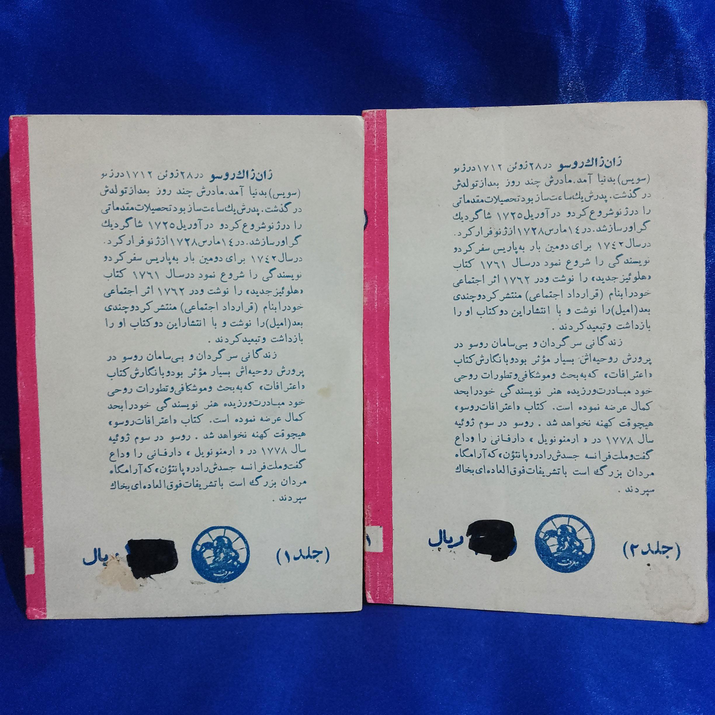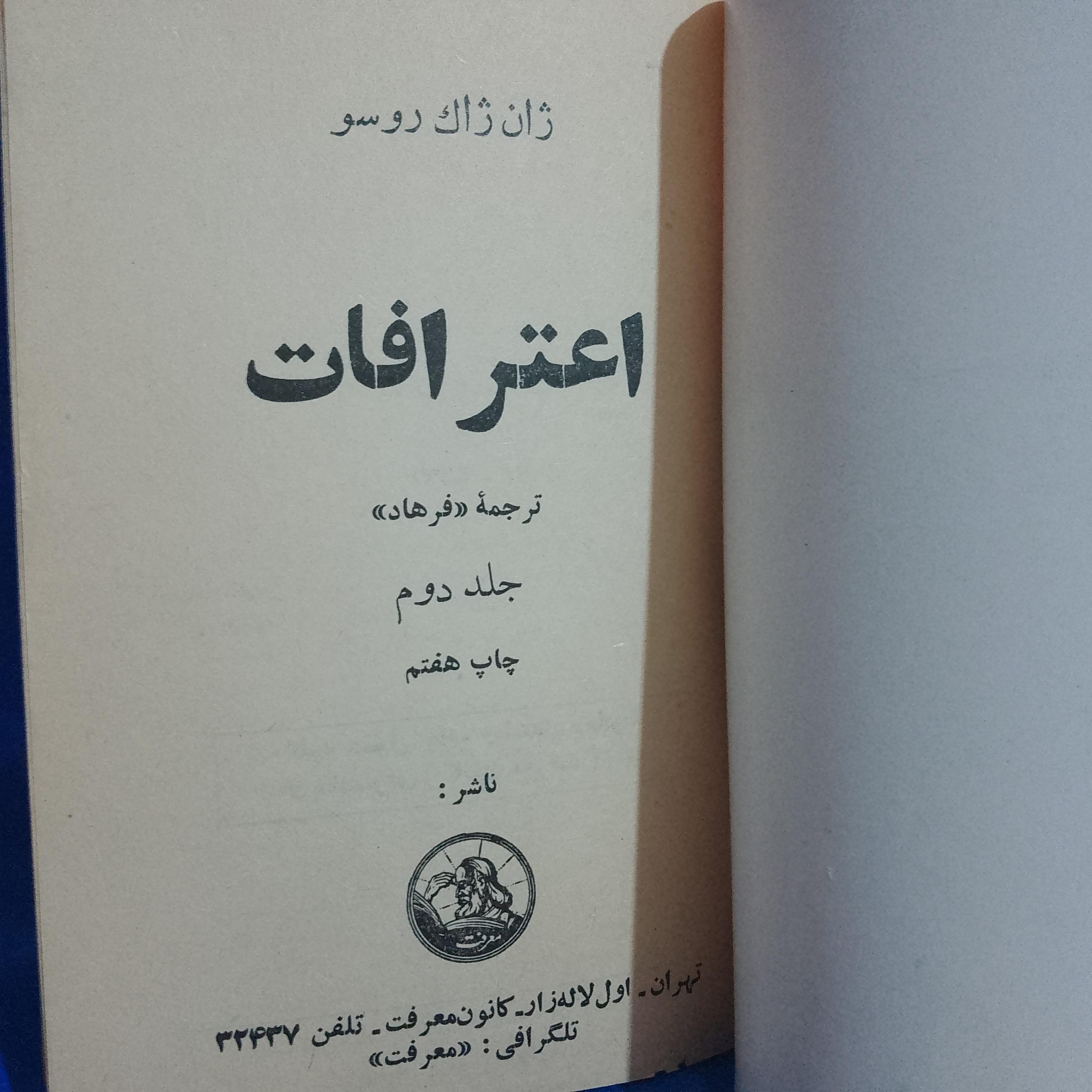 اعترافات اثر ژان ژاک روسو چاپ 1343 انتشارات معرفت در دو جلد . کتاب با وجود حدود 60 سال قدمت در وضعیت عالی هست و این چاپ دو جلدی معرفت فوق العاده نایاب هست . لبه چند صفحه از ابتدای کتاب در جلد اول بمیزان بسیار جزیی و خارج از نوشته ها رویهم تا خورده که مربوط به چاپخونه هست