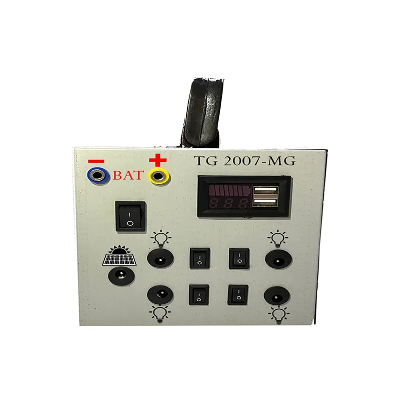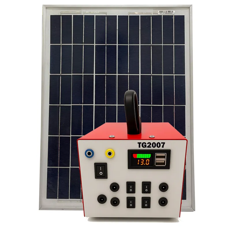 پکیج خورشیدی قابل حمل 20 واتTG2007-N1 یک پکیج قابل حمل است که از یک پنل خورشیدی 20 وات،خروجی 12 ولت,چهار خروجی لامپ 5 وات 12 ولت,تجهیزات نصب پنل, 2 عدد USB برای شارژ موبایل , قابلیت شارژ با برق شهری و پنل خورشیدی و امکان اتصال باتری یدکی برخوردار است . همچنین این پنل دارای طراحی زیبا و وزن سبک میباشد .