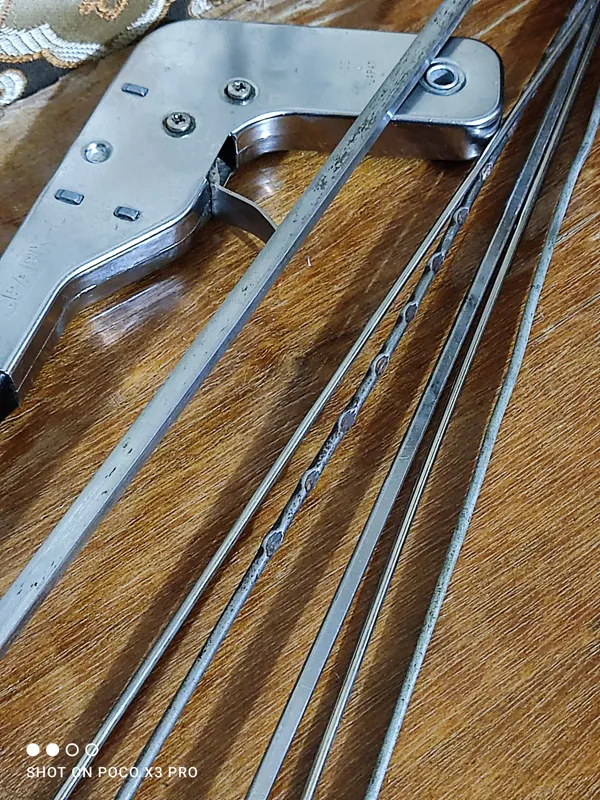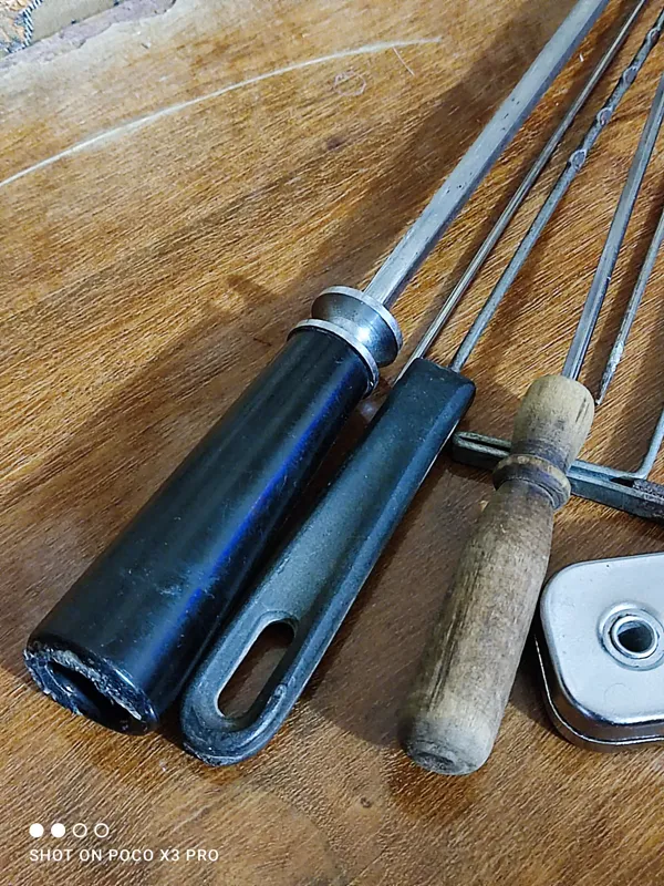 چهار عدد سیخ کبابی قدیمی و بکر مطابق تصویر سیخ دسته چوبی تمام استیل یه سیخ عالی و بی نظیره روش آرم استین استیل خورده و ژاپنی سیخ دسته مشکی فک کنم مخصوص فرگاز بوده بهمراه یک عدد فندک اشپزخانه ژاپنی اصل اصل این فندک تنها عیبش اینه که زعضی وقتا جرقه نمیزنه اما بیشتر مواقع میزنه میشه ازش استفاده کرد دو عدد میله بافتنی هم اشنتیون روشه روی هم میشه شش عدد سبخ و یک عدد فندک