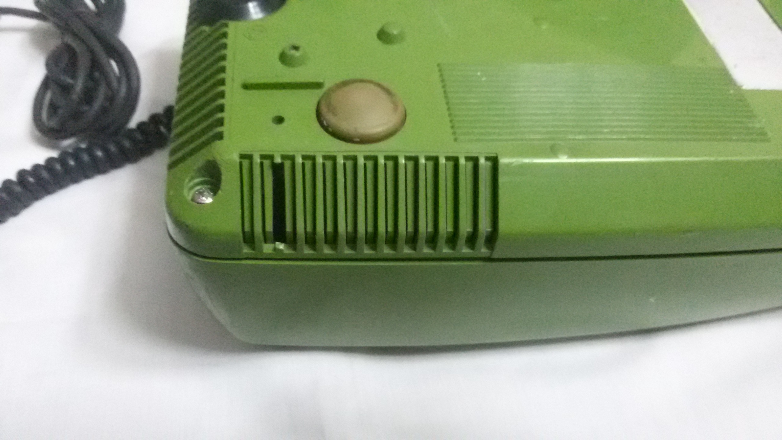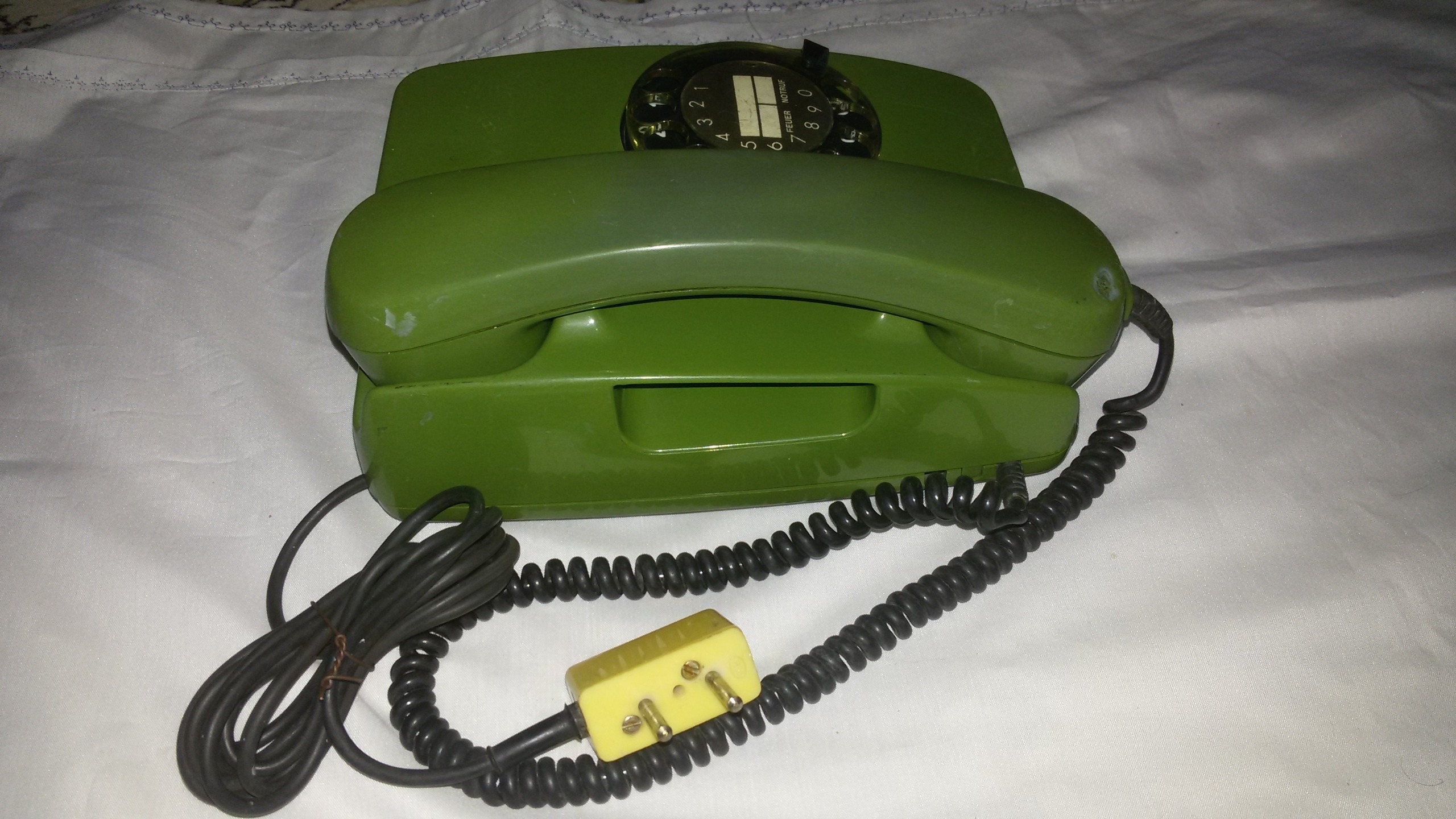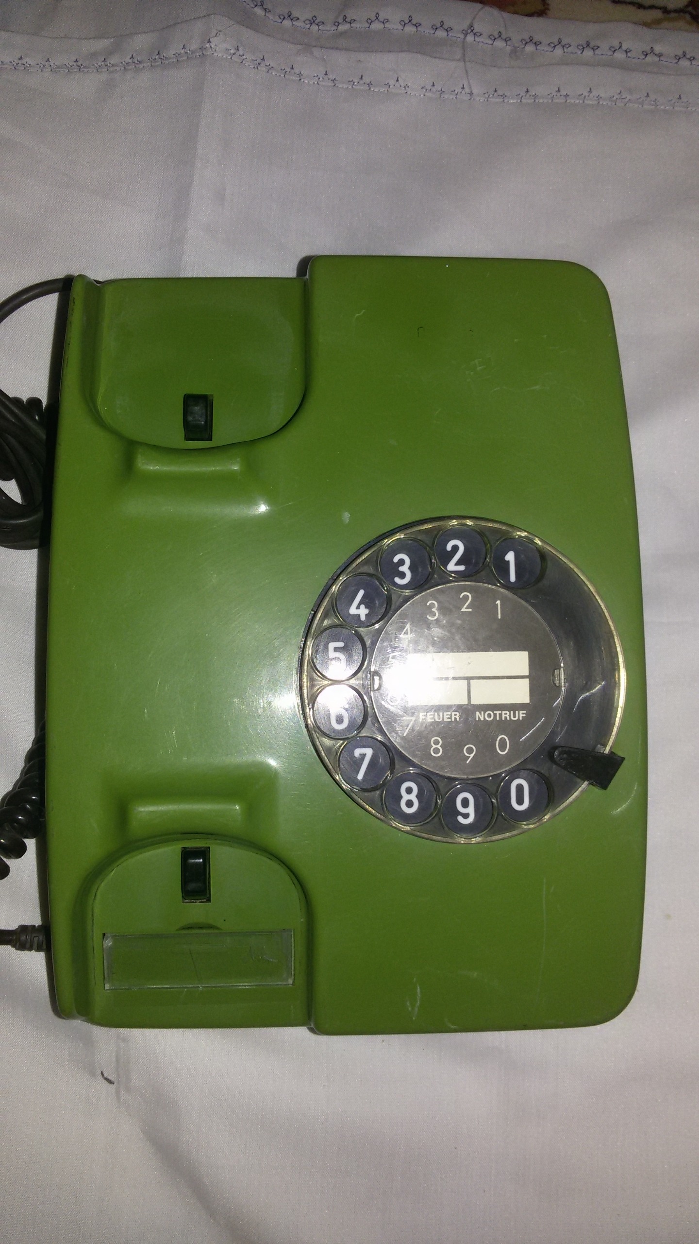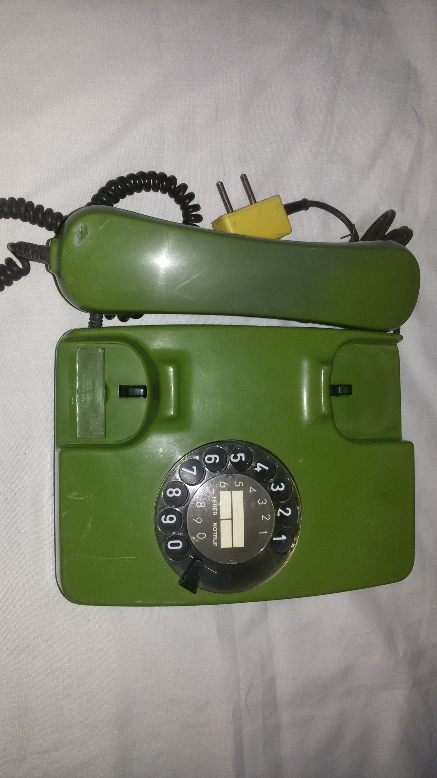 تلفن قدیمی کلکسیونی سبز رنگ که زنگ می خوره و سالمه ، شماره گیر و دکمه تنظیم صدا هم سالمند و کار می کنند. یکی از شیارهای زیر قاب شکسته که جلب توجه نمی کنه البته عکس گذاشتم دیده بشه.