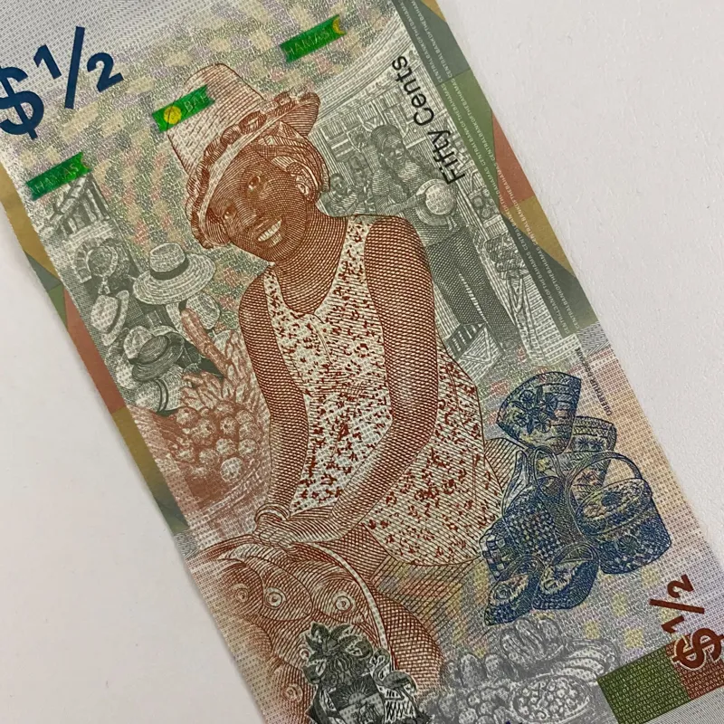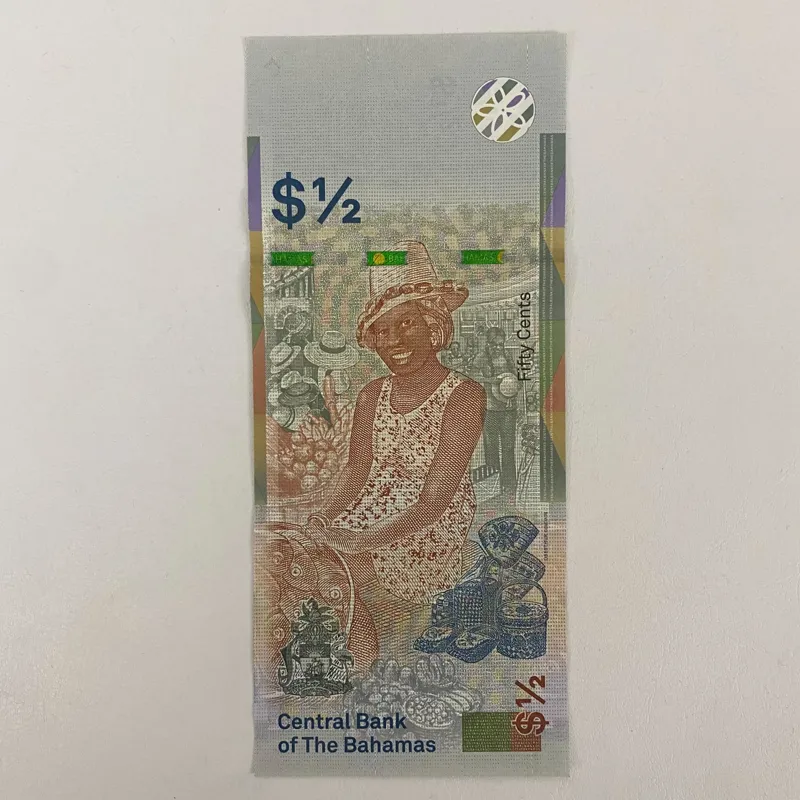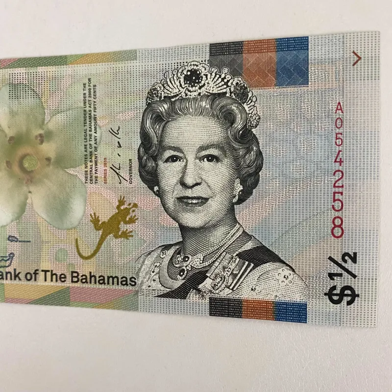 اسکناس نیم دلار کشور باهاما، کشوری در بخش غربی اقیانوس اطلس که متشکل از بیش از 700 جزیره است. تصویر اسکناس جوانی "ملکه الیزابت".