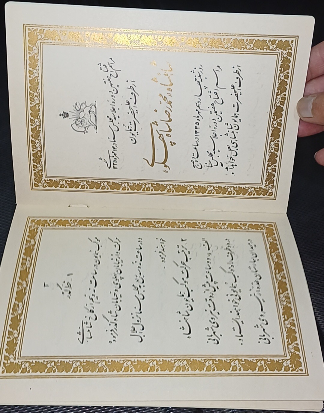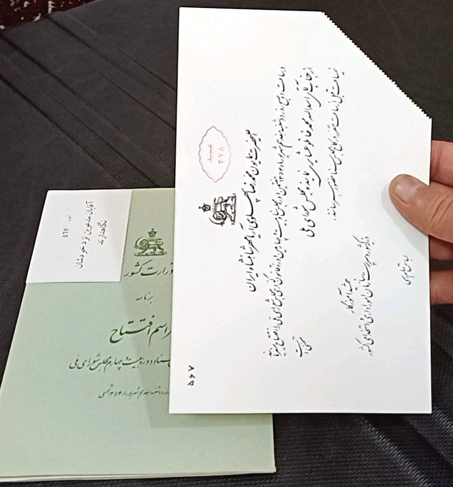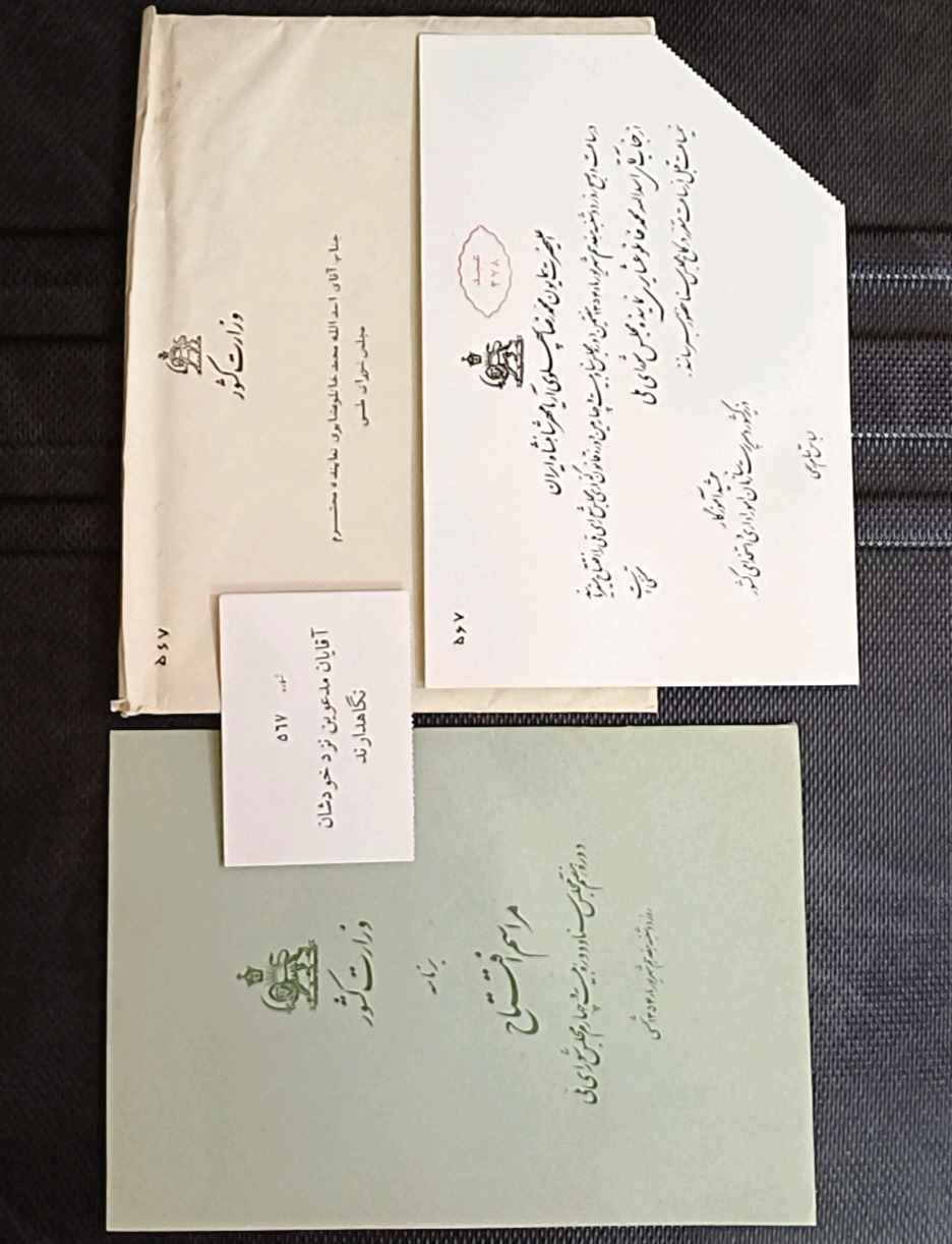پک بسیار کمیاب برنامه افتتاح مجلس،سال 1354 توسط محمدرضاشاه پهلوی،به همراه کارت دعوتنامه،کارت جایگاه،کتابچه کمیاب مراسم و پاکت ارسالی وزارت کشور،این پاکت ومحتویات آن برای آقای *** نماینده مجلس ،که از خوانین بنام ایران هم بوده ارسال شده که دست نخورده بعنوان سندی از تاریخ معاصر به یادگار مانده است.توجه:پاکت و محتویات اون کاملا نو و سالم و تمیز هستن که برای اولین بار خودم پاکت رو باز کردم.در آخر کتابچه دو برگ بزرگ تاشو از نقشه تالار و صحن مجلس و محل جلوس شاه و مدعوین قرار دارد.این کتابچه فقط به نمایندگان مجلس و میهمانان ویژه مراسم اهدا میشده