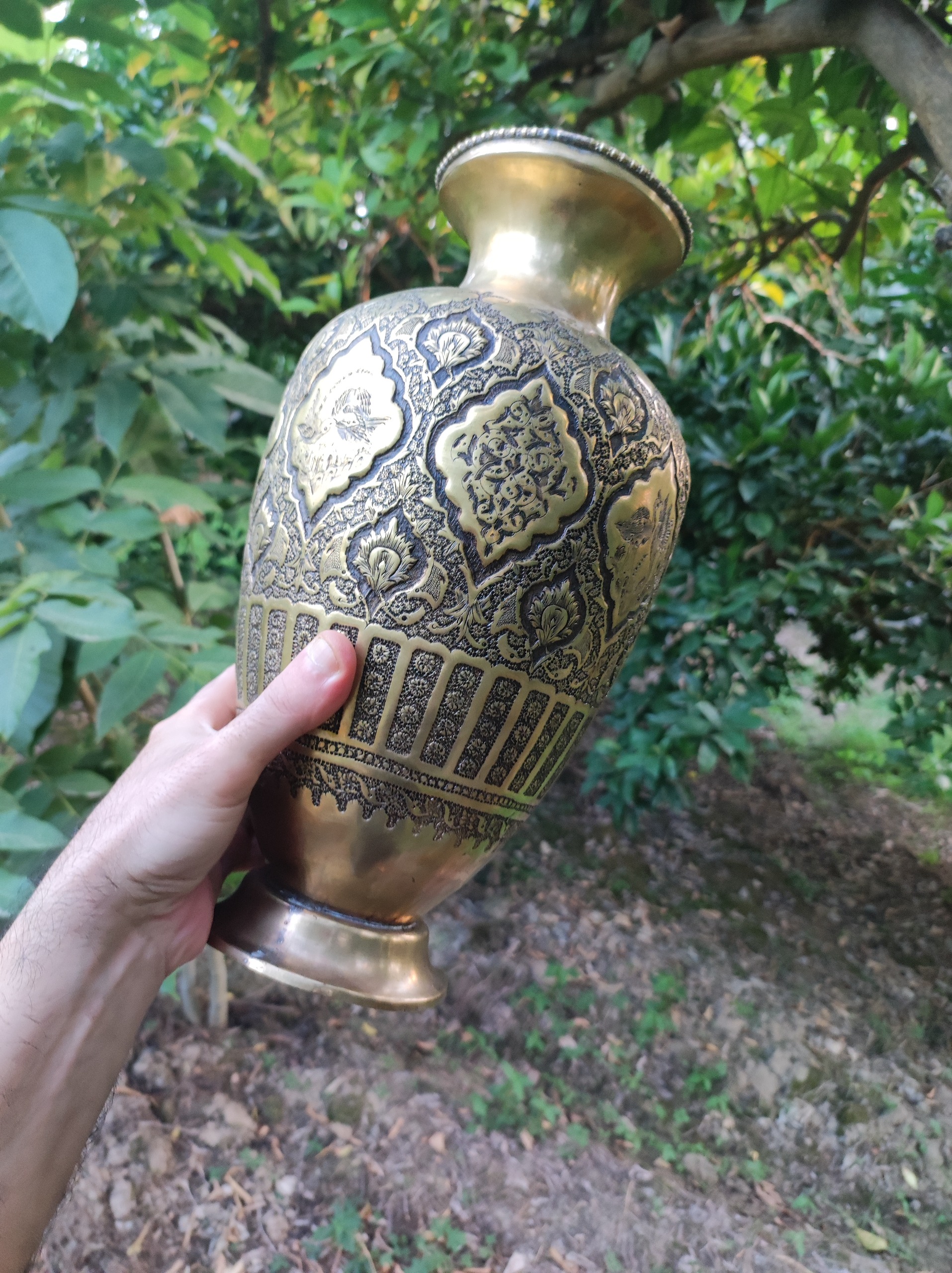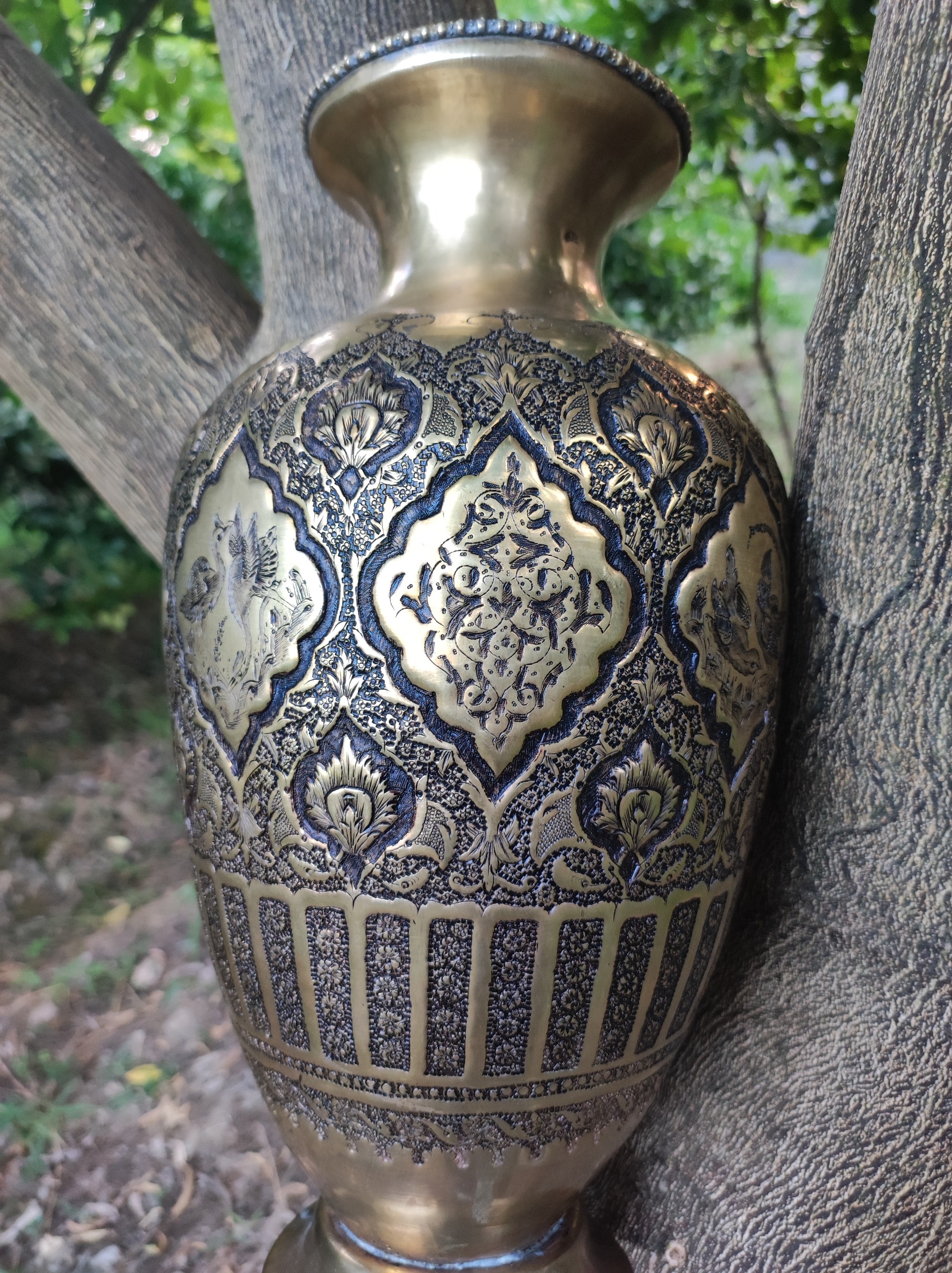 شاهکار قلم زنی بیتکرار ظرف یا جام با گلدان جنس برنج