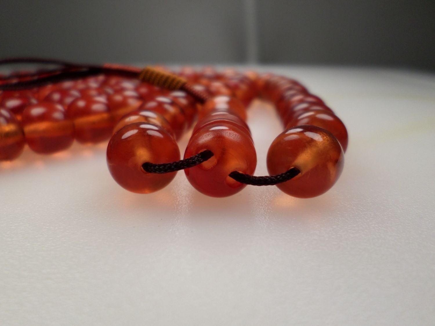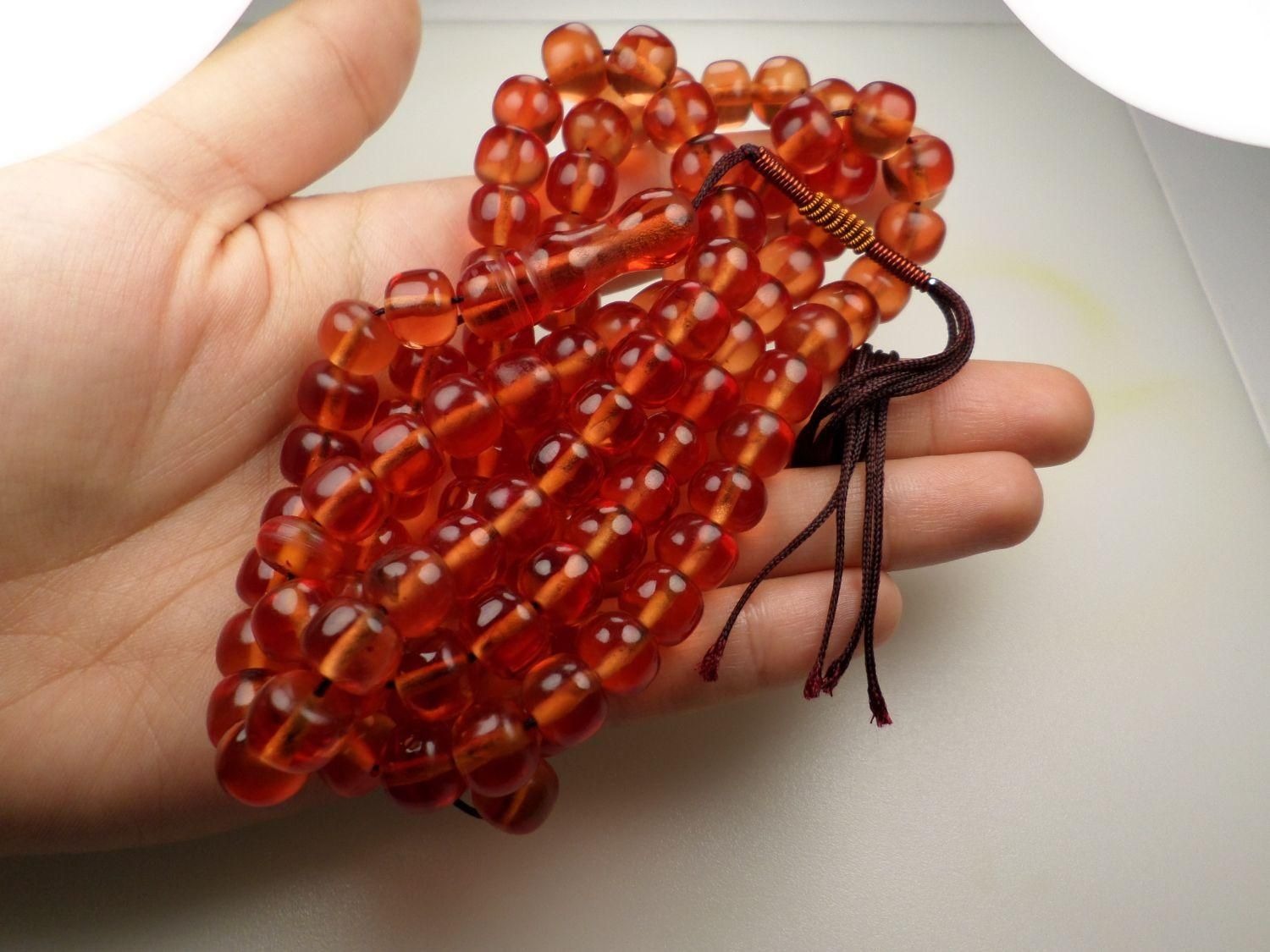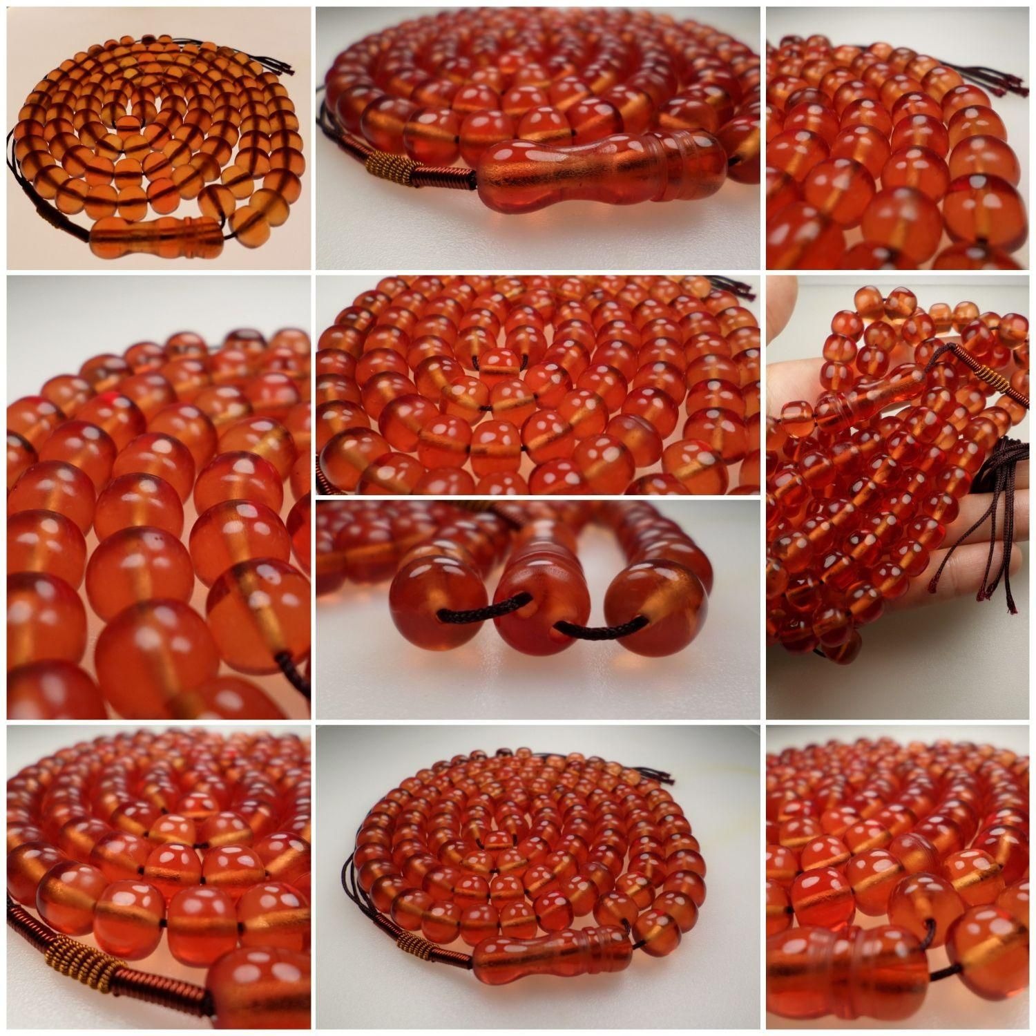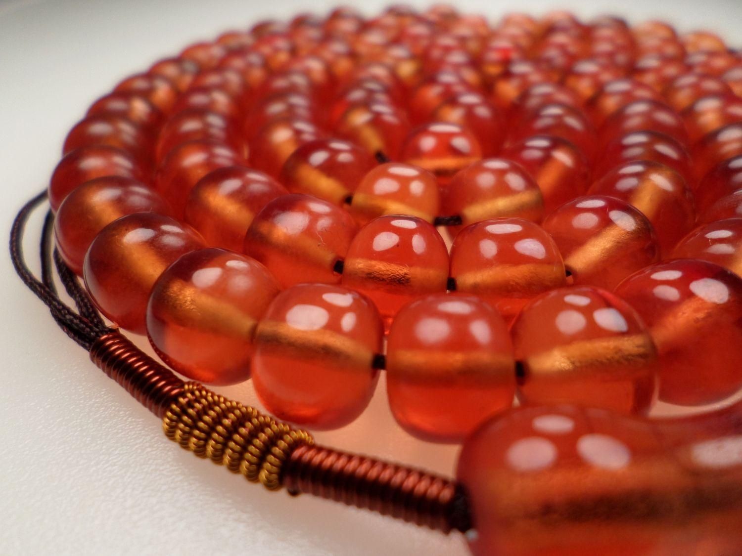 تسبیح سندلوس 101 عددی غول پیکر و وزن بالا به رنگ سرخ زعفرانی شمش اروپایی و تراش تمام دست ، نسبتا کهنه تراش ، قیچی بر است.