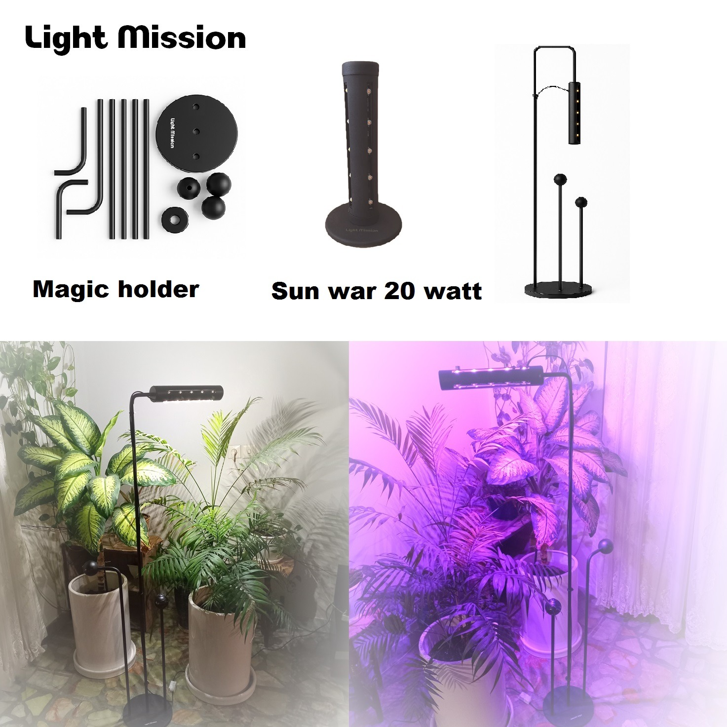 ترکیبی از دو محصول لایت میژن: پایه مجیک هولدر لایت میژن و چراغ رشد گیاه لایت میژن مدل sinwar 20 watt است .