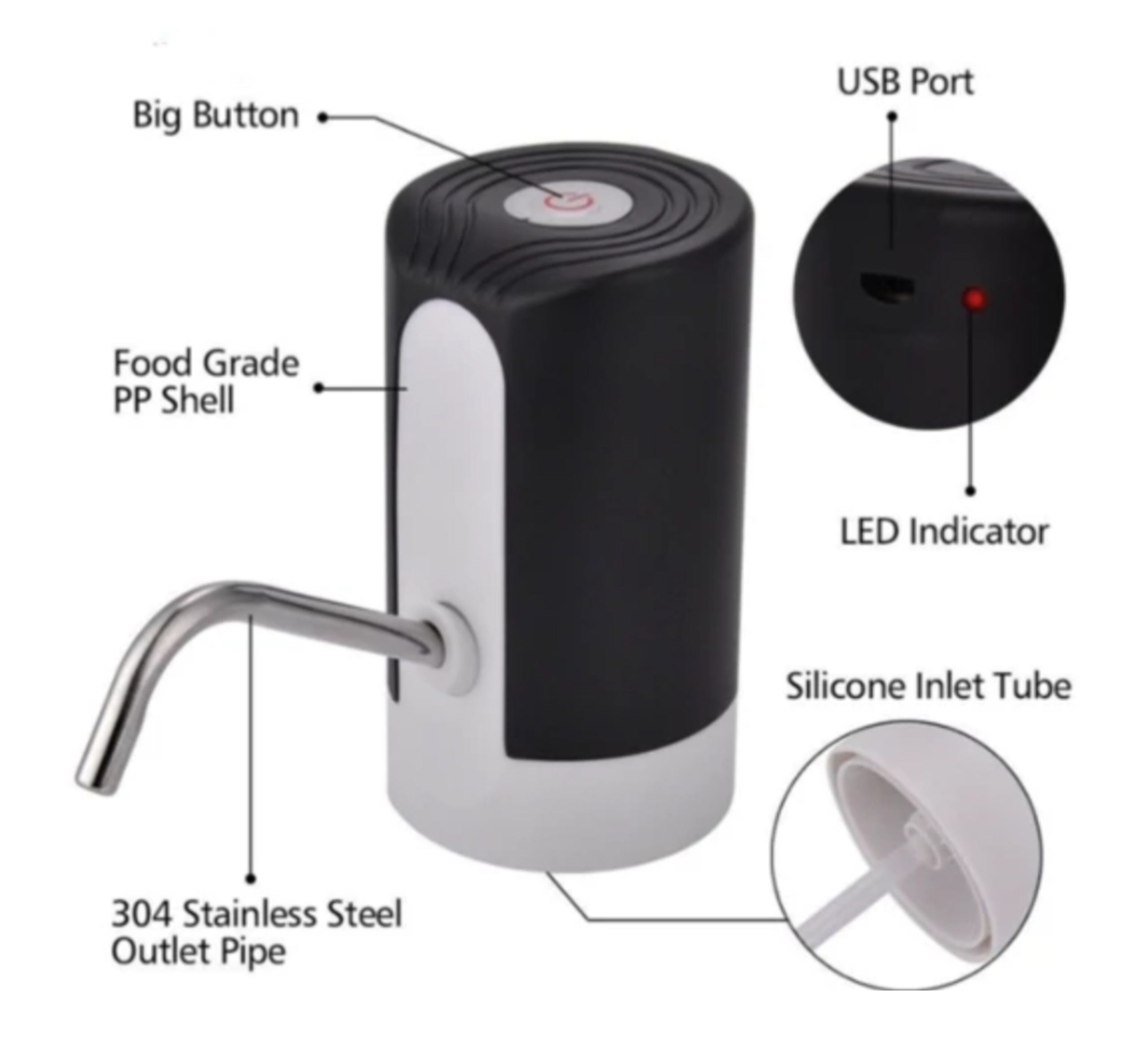 پمپ آب برقی شارژی زندگی را آسان تر و بهتر می کند. قابل استفاده مجدد و 100٪ بی خطر برای نوشیدن آب. پمپ آب اتوماتیک در وقت و انرژی صرفه جویی می کند. قابل شارژ با USB می باشد. در صورت شارژ کامل می توان از 4 تا 6 گالن آب استفاده کرد. دارای استفاده آسان با فشار