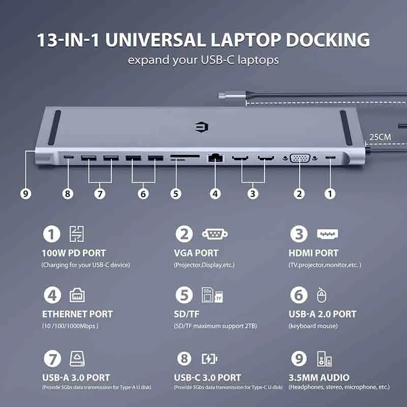 تجربه اتصال خود را با همه کاره 13 در 1 USB C ارتقا دهید، یک نیاز همراه برای زندگی روزمره و کار. این هاب جامع شامل 2 پورت HDMI، 1 پورت VGA، اترنت، 2 پورت USB 3.0، USB-C 3.0، 2 پورت USB 2.0، یک اسلات کارت SD/TF، یک جک صوتی 3.5 میلیمتری، یک اسلات میکروفون