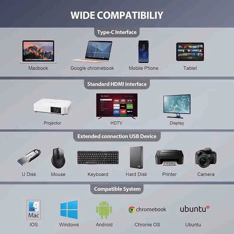 تجربه بصری خود را با خروجی HDMI 4Kesam30Hz این داک USB C را ارتقا دهید. این همراه ایدهآل برای گیمرها، طراحان و کاربران تجاری است و ویدئوهای واضح و صدای واقعی را بدون هیچ گونه تاری یا تداخل حرکتی روی صفحه نمایشهای خارجی ارائه میدهد.