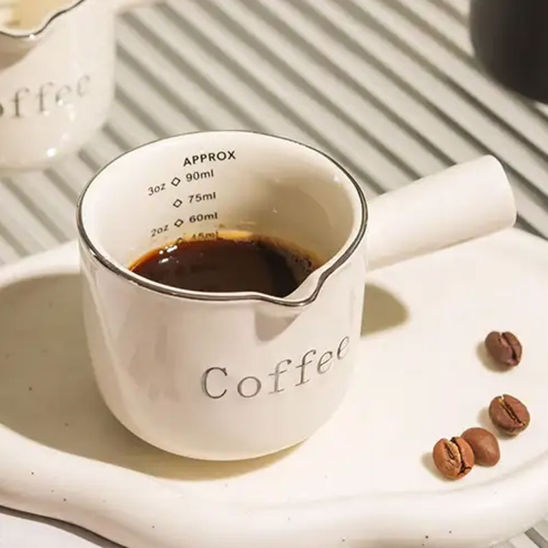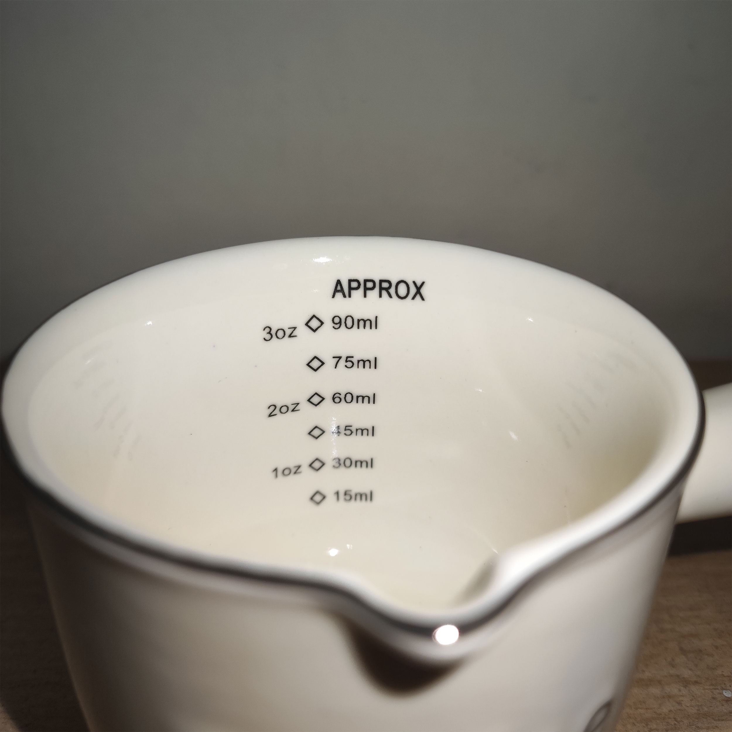 این دوزینگ کاپ از جنس سرامیک ساخته شده است. گنجایش آن 90 میلی لیتر یا 3 اونس است که در داخل پیمانه درج شده است. برای حمل راحتتر برای این پیمانه دارای دسته است. ویژگی جالب این دوزینگ کاپ این است که در کناره آن لبه تعبیه شده است که میتوانید برای ریختن مایعات نیز از آن استفاده کنید. که به عنوان بشر یا پیمانه آشپزی نیز کاربرد دارد.