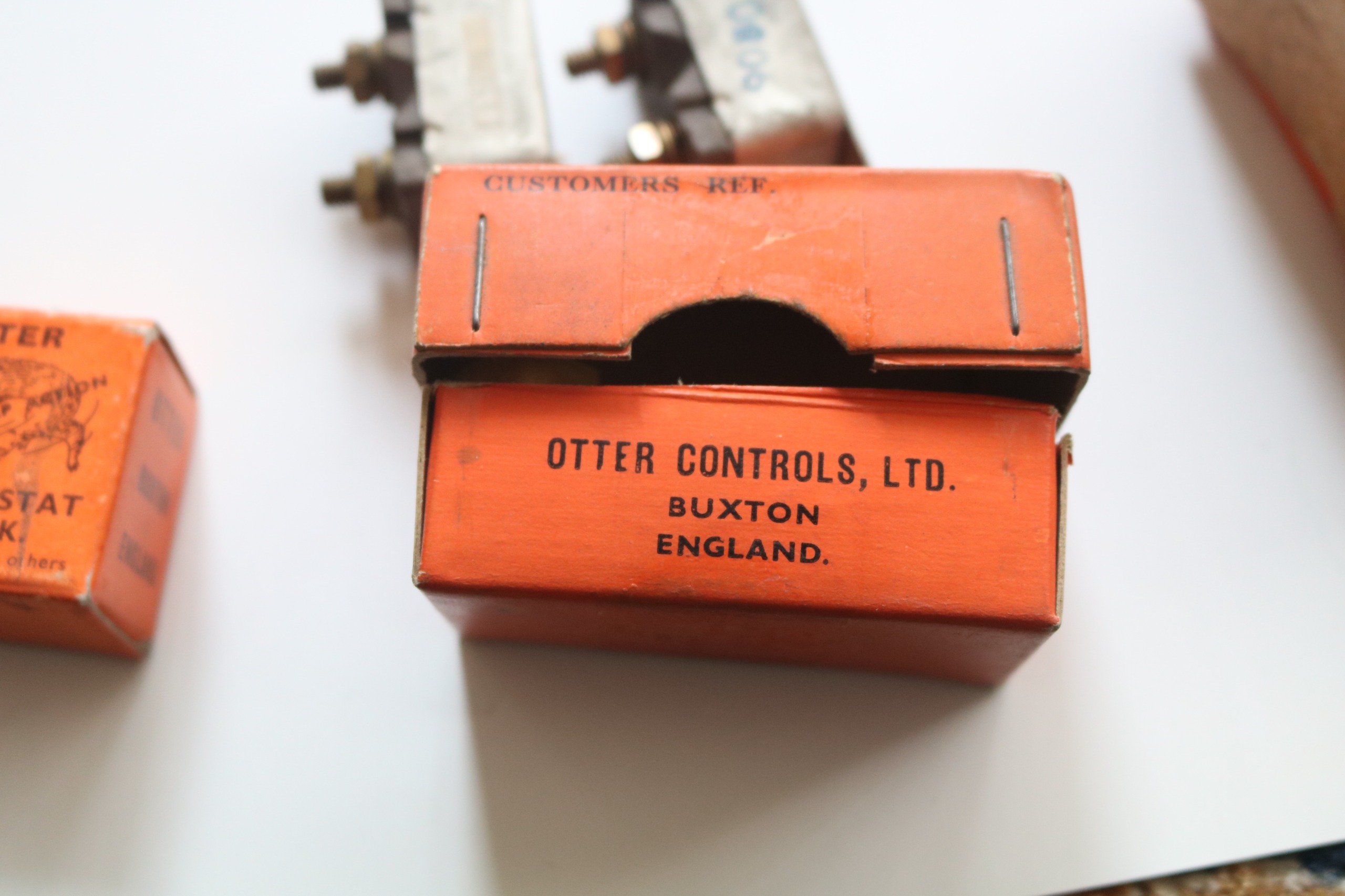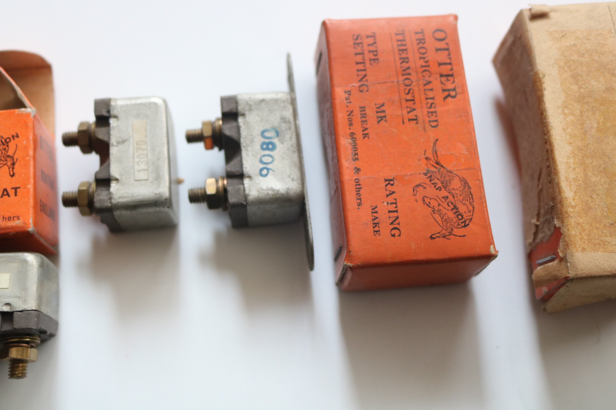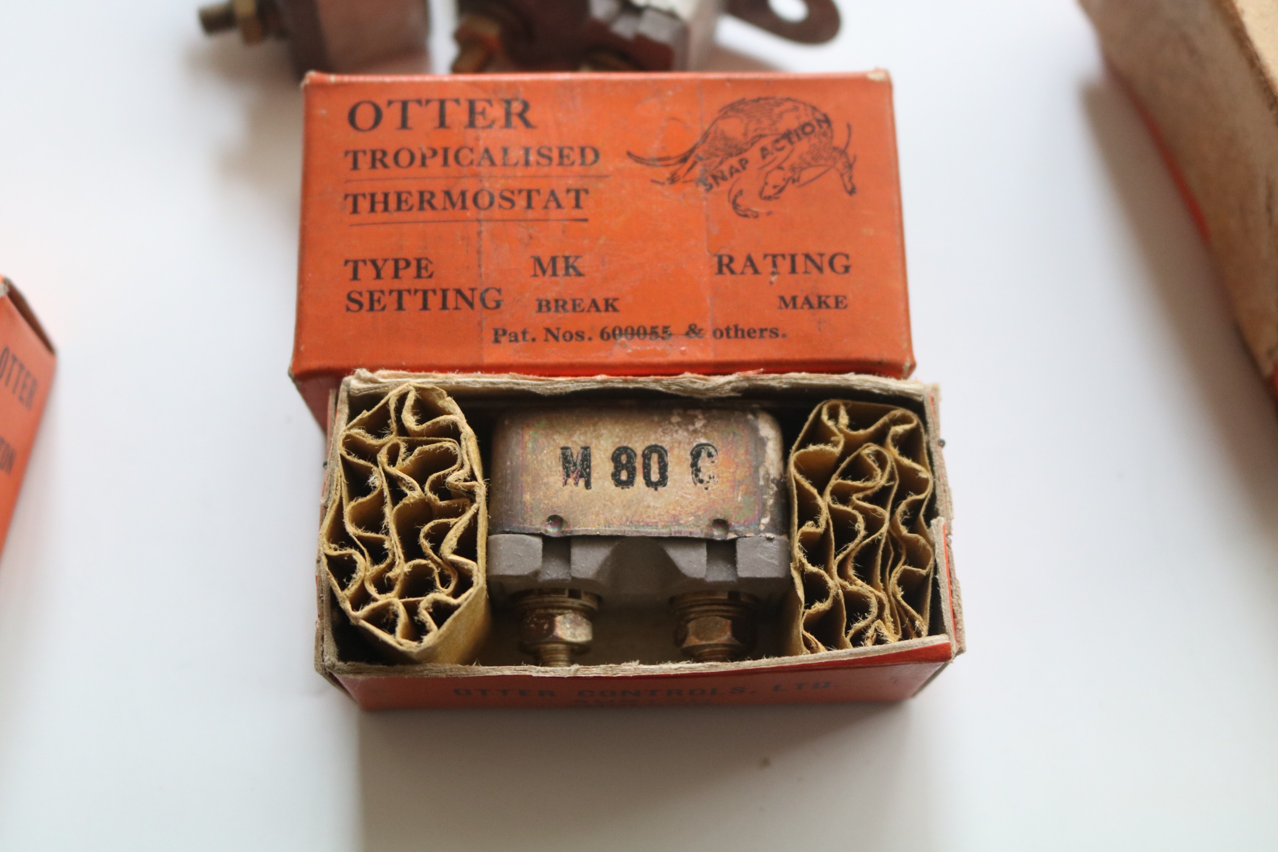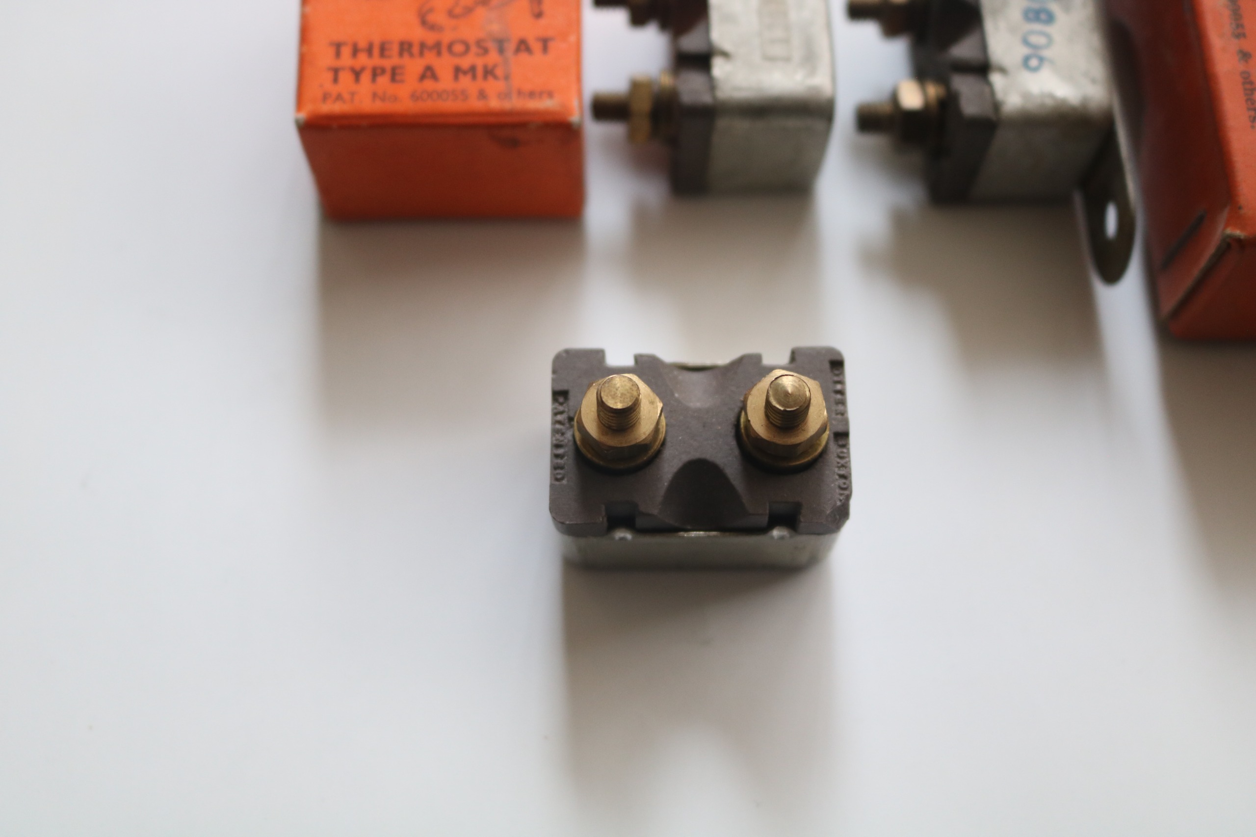 کلید ترموستاتی ساخت کارخانه OTTER BUXTON انگلستان مربوط به سال 1964. مدل A Mk.III 5CZ/6115 به تعداد 5 عدد که همگی سالم بوده و 3 تا از آنها در جعبه فابریک می باشند. کاربرد این کلید ترموستاتی در کوره های صنعتی و خانگی، نیروگاه، هواپیما، قایق، خودرو و پرتاب کننده موشک می باشد. برای کار در دماهای بالا تا حداکثر 538 درجه سلسیوس طراحی شده است. کنتاکت های 3 عدد از آنها به صورت Normaly Open و دو عدد به صورت Normaly Close می باشد. هنگامی که حرارت بالا برود و کنتاکت ها داغ بشوند، تغییر وضعیت می دهند به طوری که Normaly Open ها وصل شده و Normaly Closeها قطع می شوند و با سرد شدن کنتاکت مجدداً به وضعیت اولیه باز می گردند. عملکرد کنتاکت به نظر بیمتالی می باشد و مشابه ترموستات سماورهای برقی است. با توجه به محل اتصال الکتریکی به نظر می رسد جریان 2 آمپر را می تواند قطع و وصل نماید. دمای عملکرد مشخص نیست ولی در تست عملی به نظر می رسد در دمای 100 درجه سلسیوس عمل نماید.